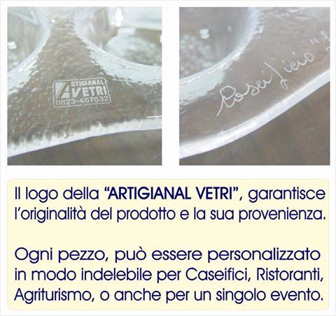 Il logo "ARTIGIANAL VETRI" garantisce l'originalità del prodotto. Ogni pezzo può essere personalizzato, in modo indelebile, per caseifici, ristoranti, agriturismo o per un singolo evento.