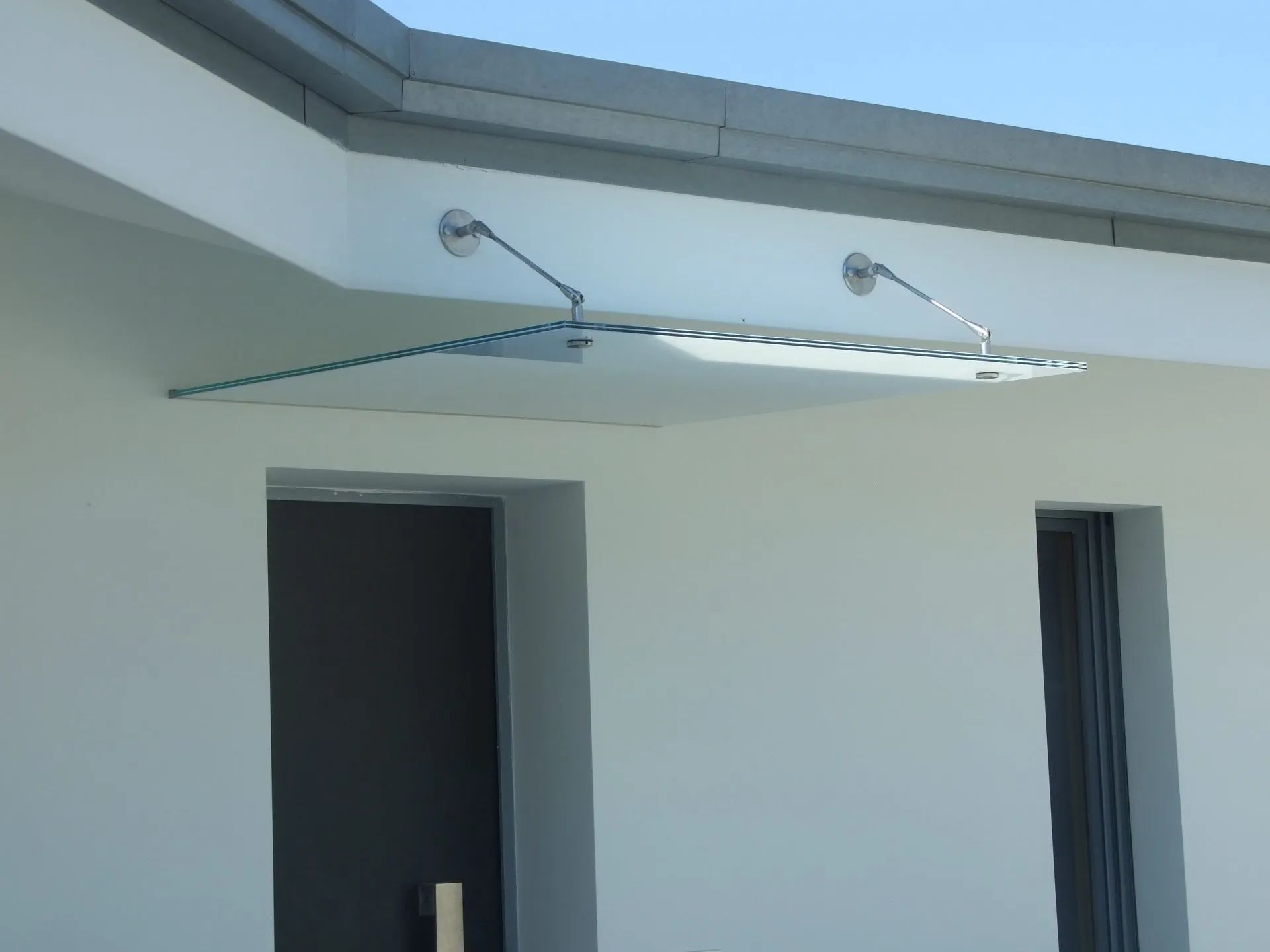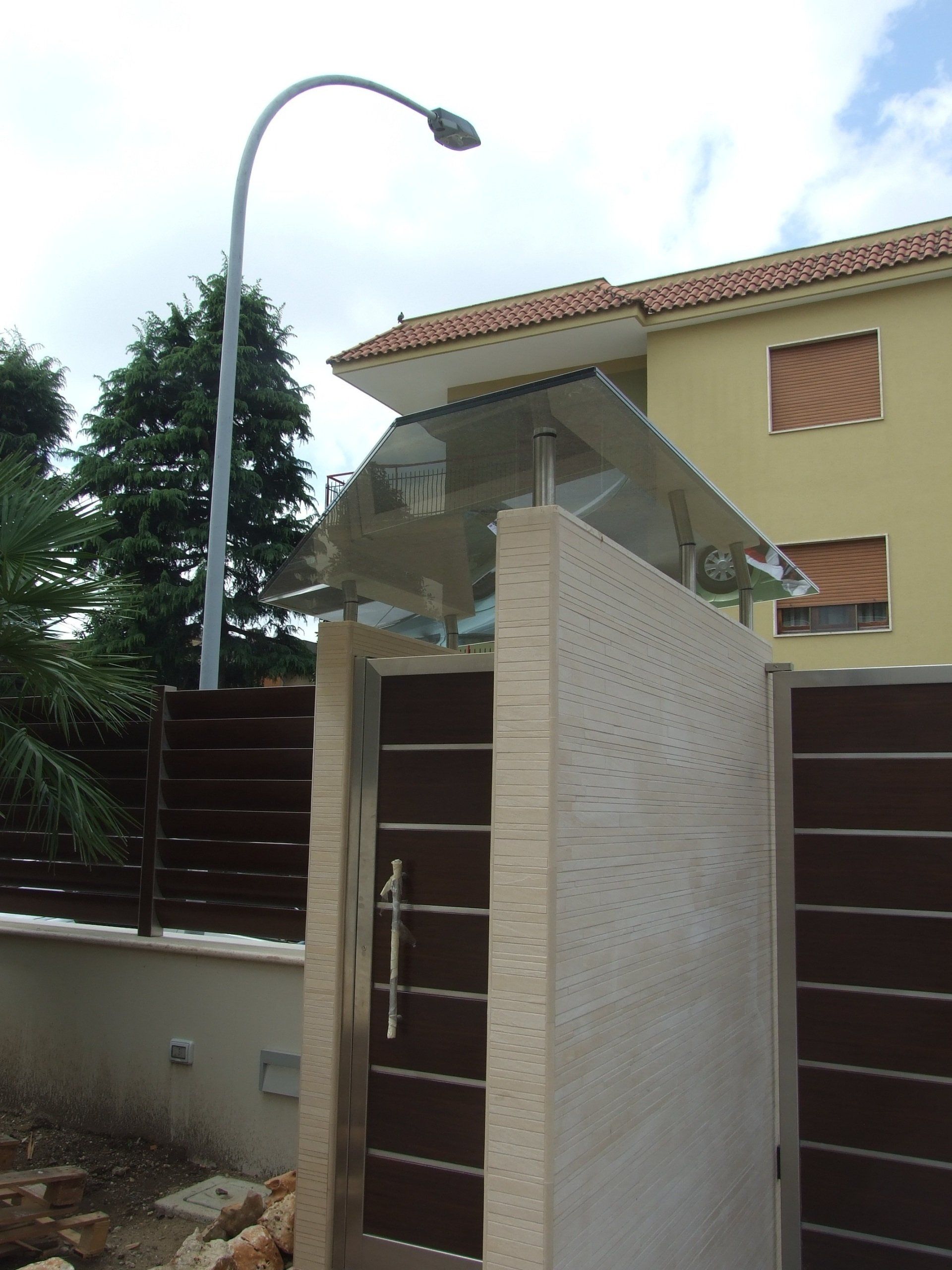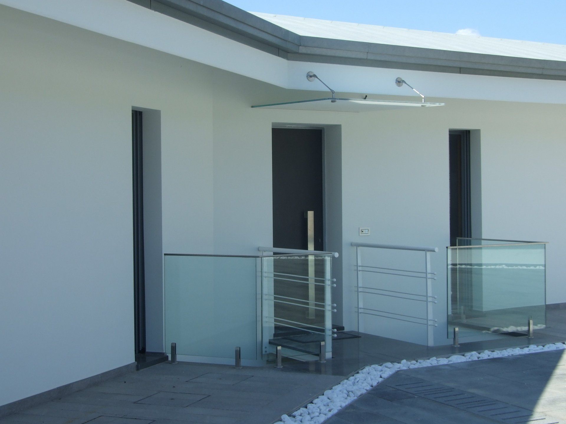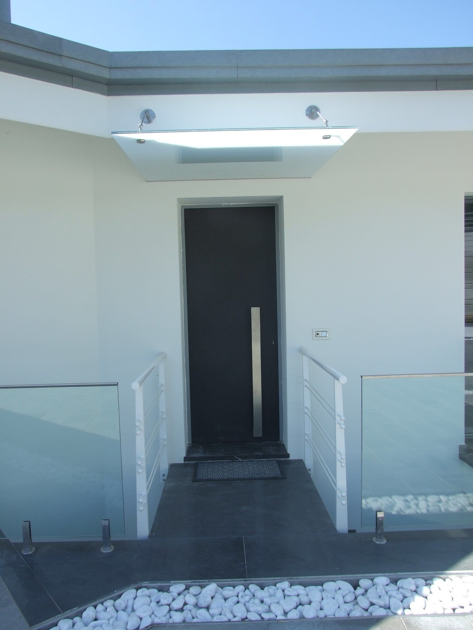 Pensilina in vetro extrachiaro 5+5 temperato e laminato con distanzali in acciaio cromo-lucido.