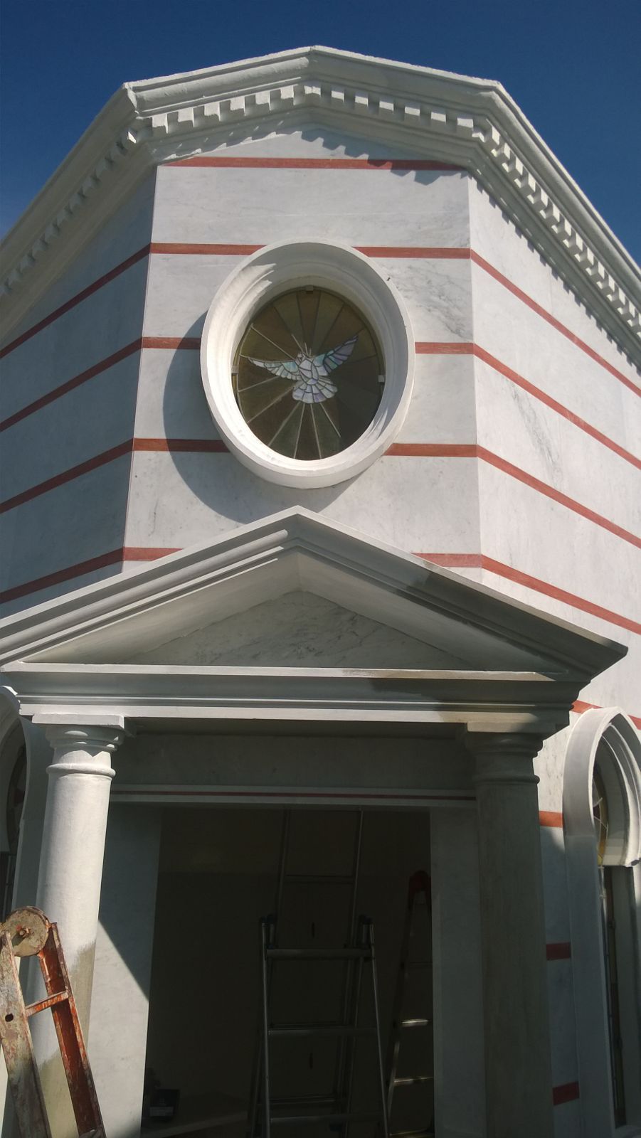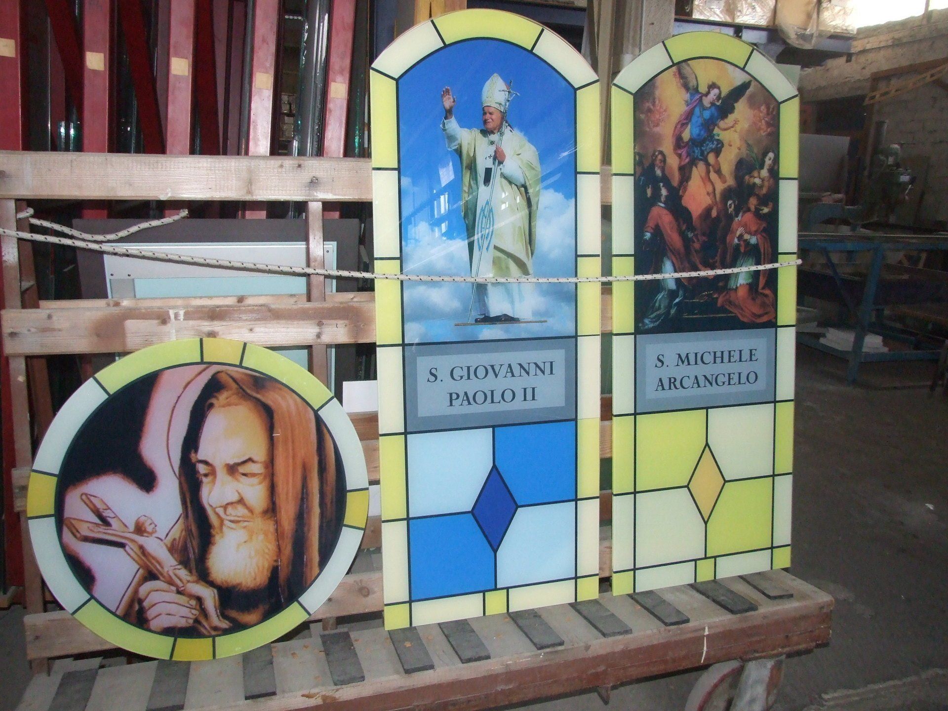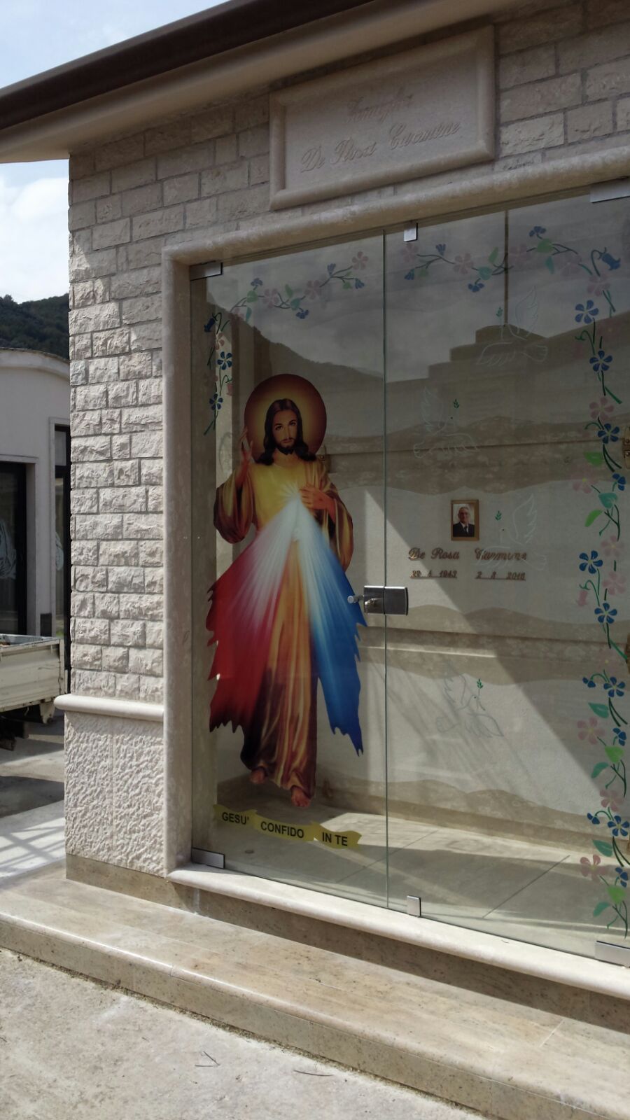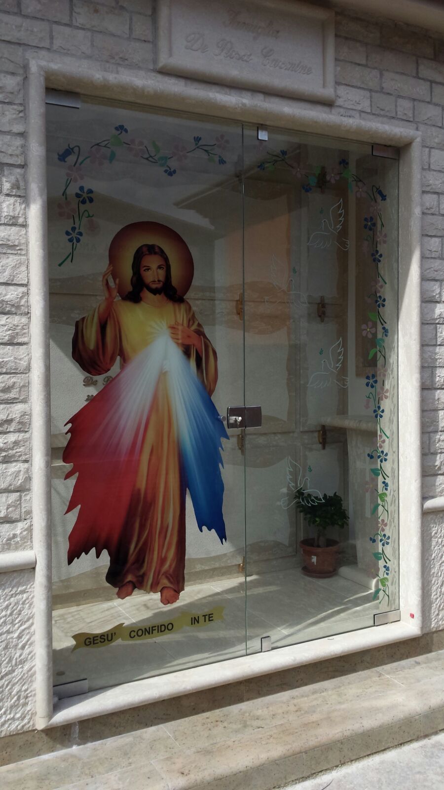 Pannelli per cappella cimiteriale in vetro fuso 5 mm con stampa digitale. Realizzato su commissione.