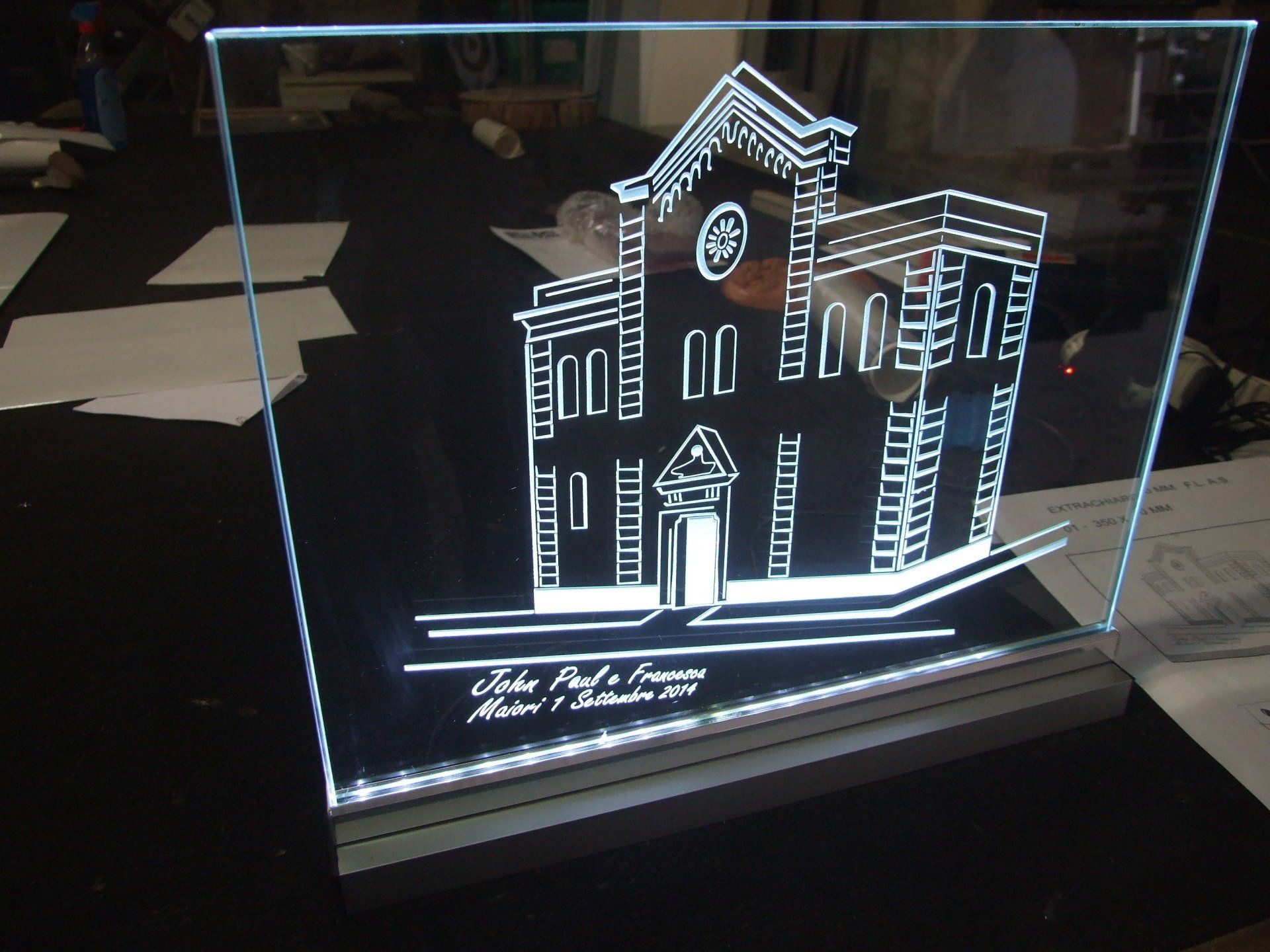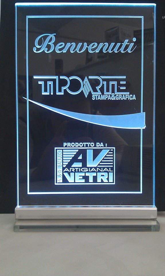 Targa celebrativa in vetro 8 mm extrachiaro, con decoro scavato, strip led e base in alluminio.