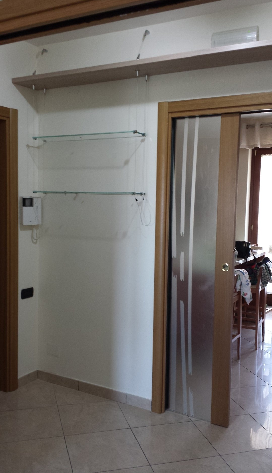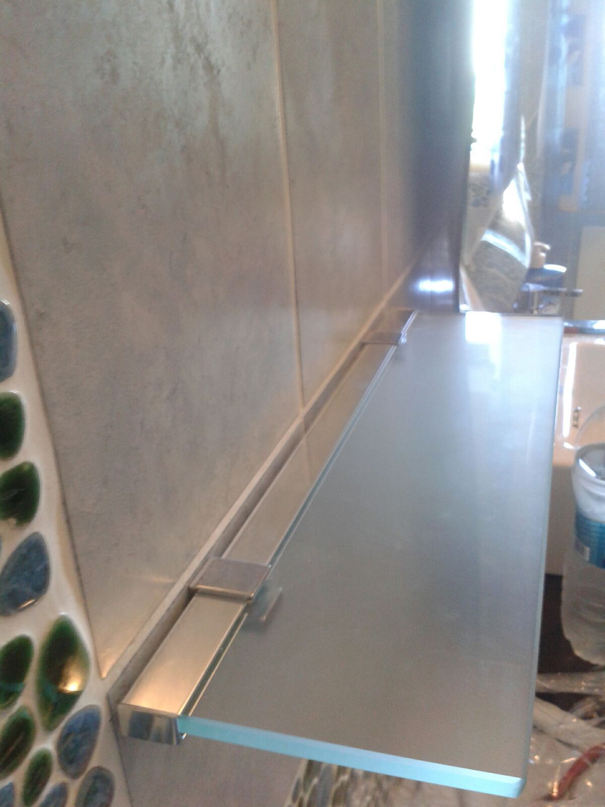 Mensole in vetro extrachiaro 8 mm sabbiato con profilo posteriore ad U in alluminio satinato.