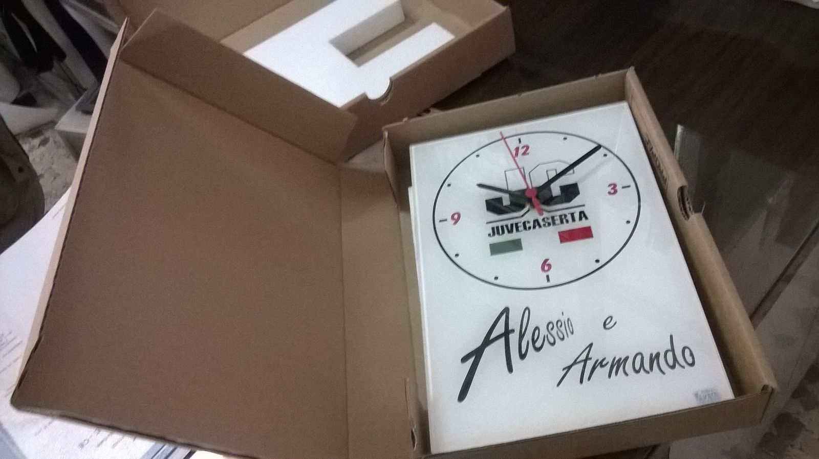 Orologio in vetro 5 mm smaltato bianco, decorato a mano e personalizzato con logo Juvecaserta e nomi.
