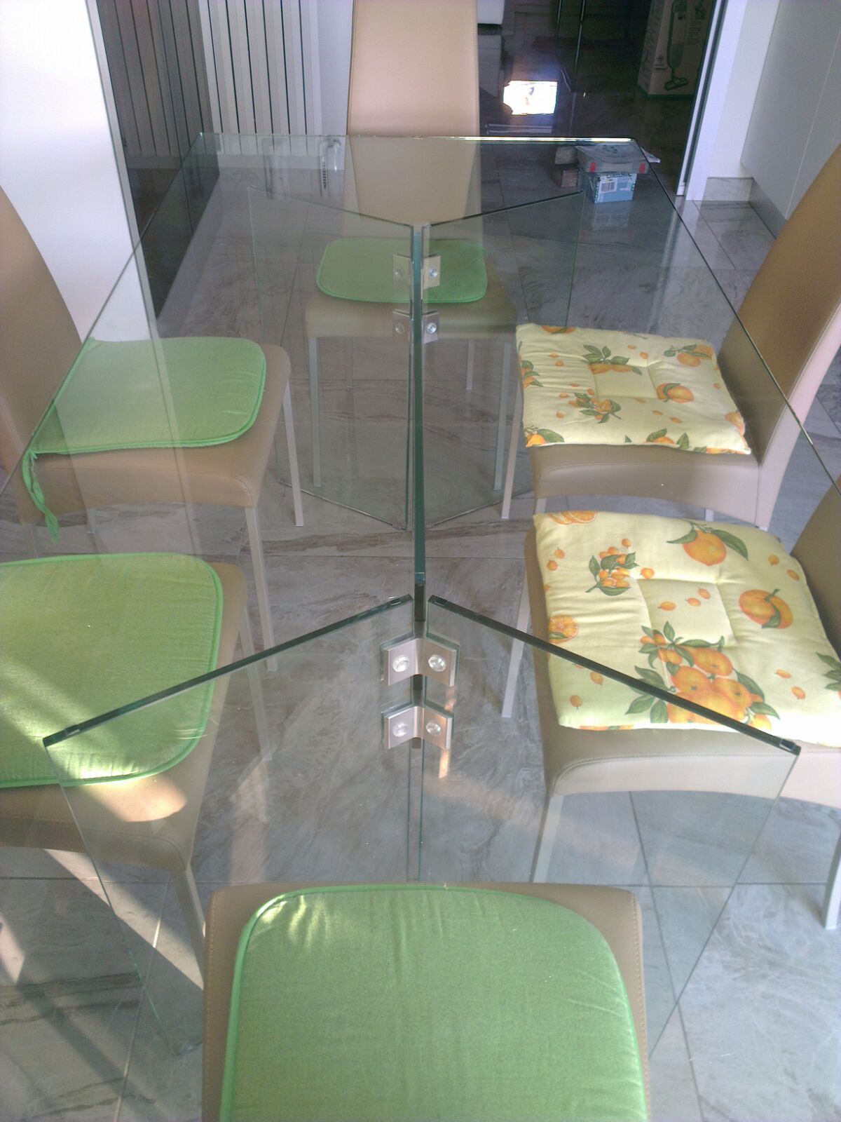 Tavolo da pranzo in vetro extrachiaro 10 mm temperato con morsetti in acciaio satinato.