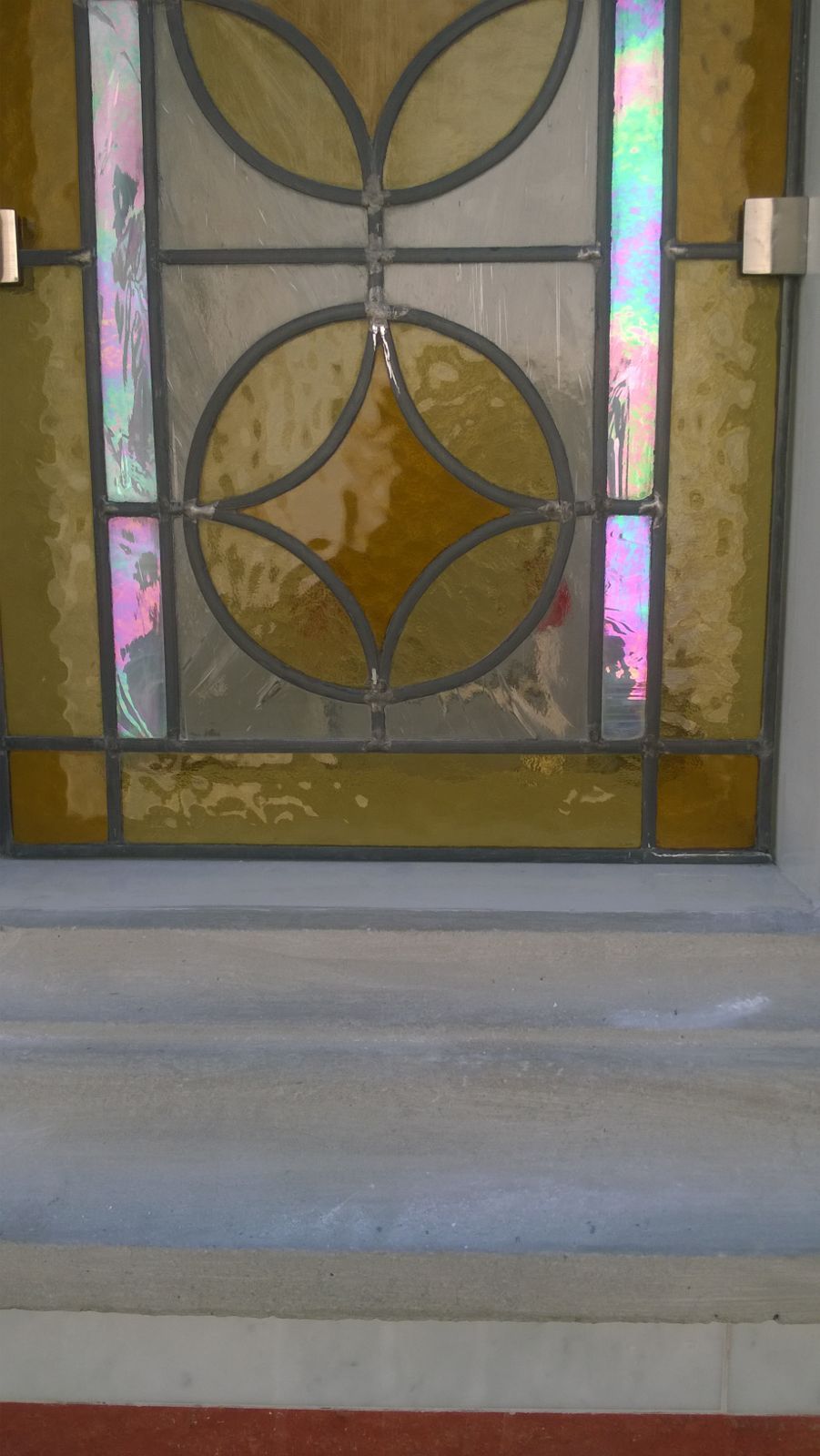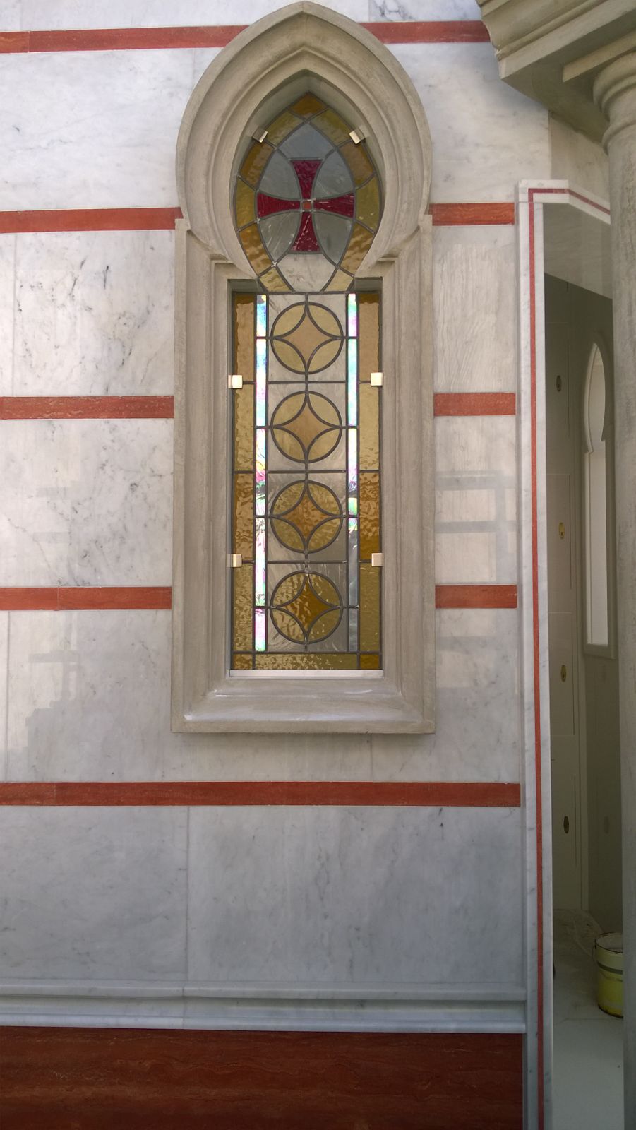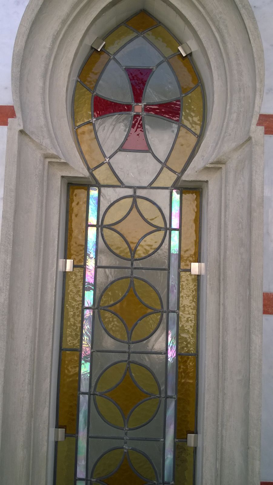 Vetrata per cappella cimiteriale, rilegata a piombo, in vetro fuso, con morsetti in acciaio cromo-lucido.