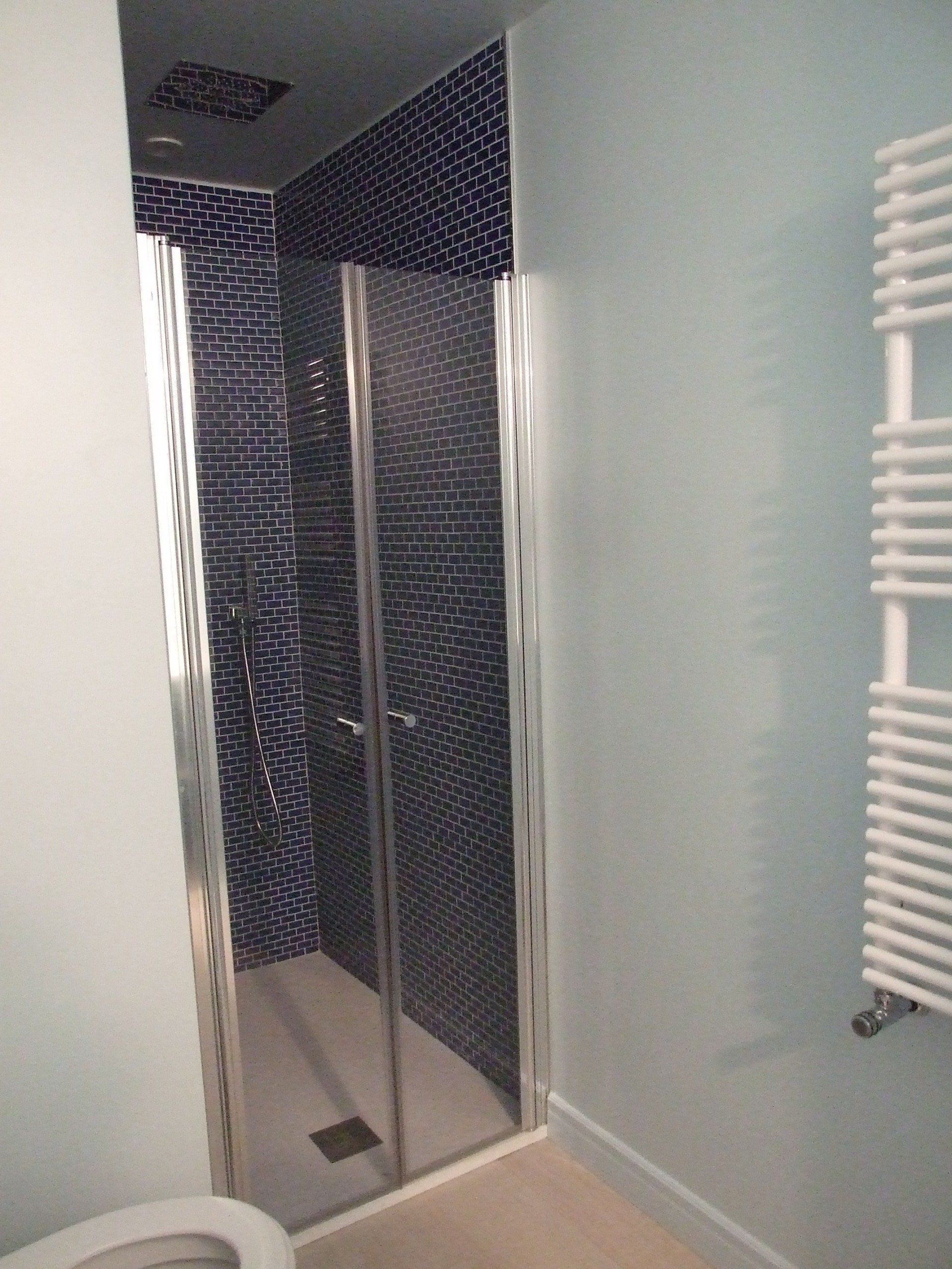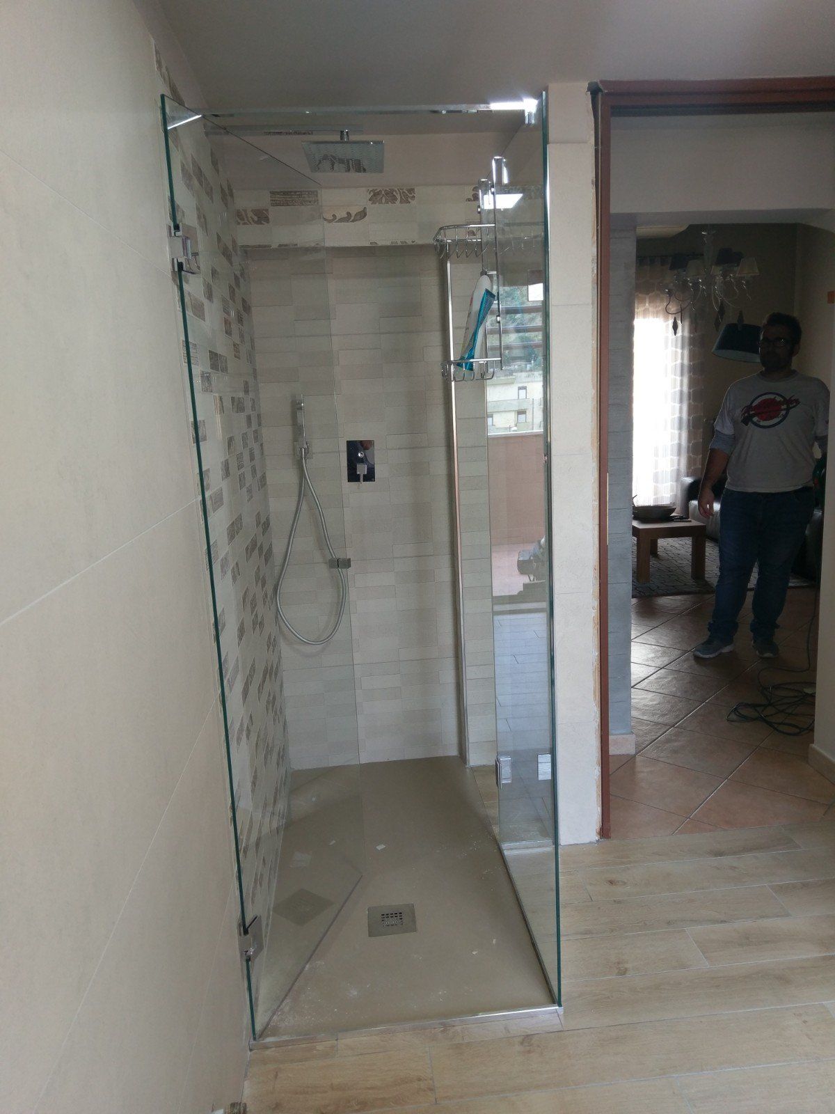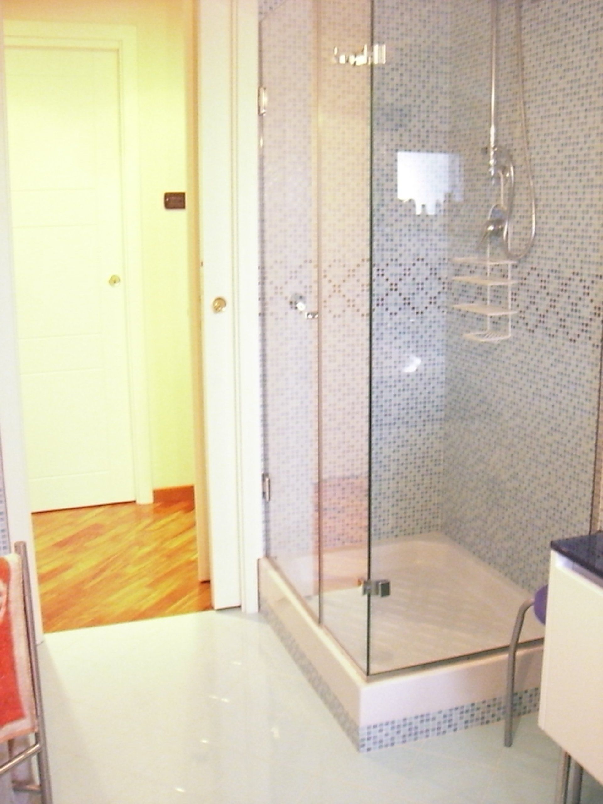 Box doccia personalizzato, con doppio fisso e anta in vetro extrachiaro 8 mm temperato. Cerniere, accessori e profili in acciaio cromo-lucido.