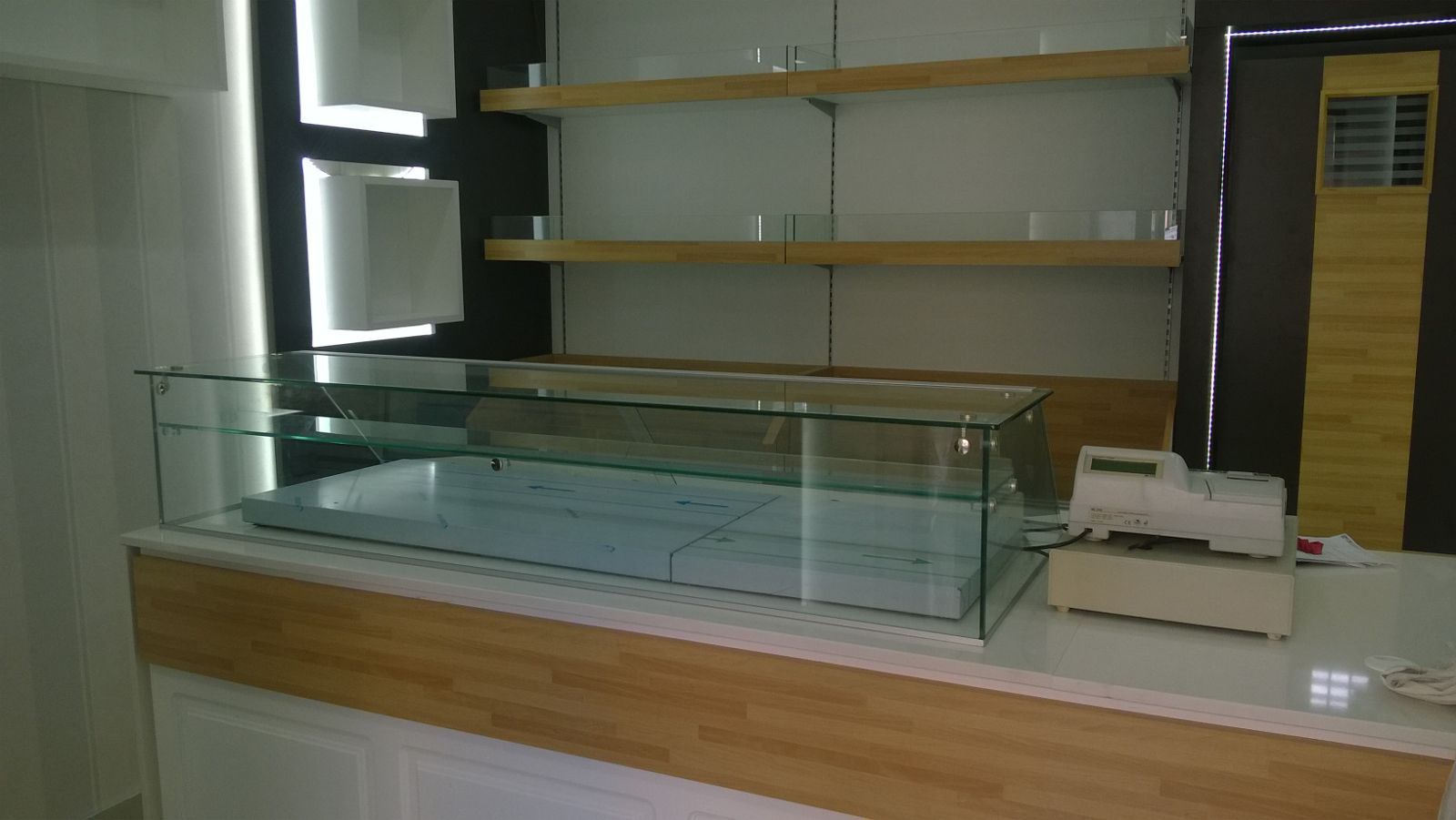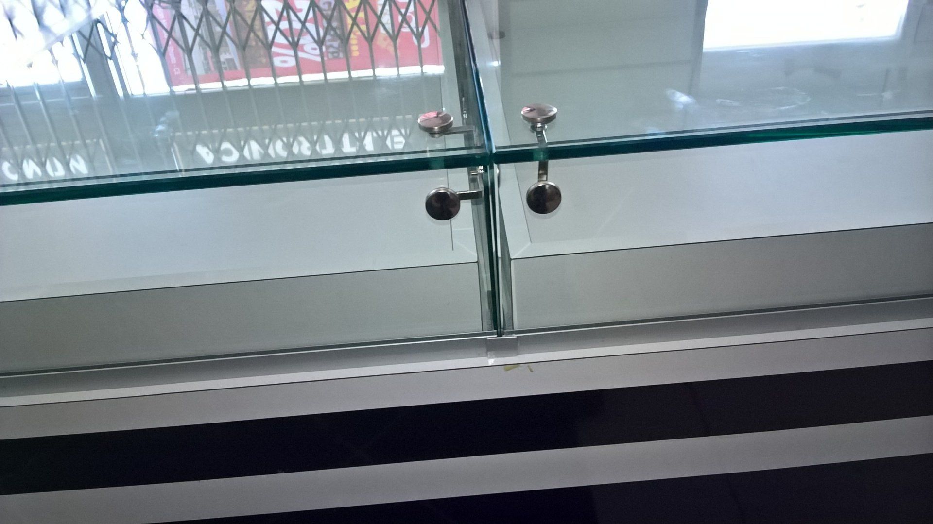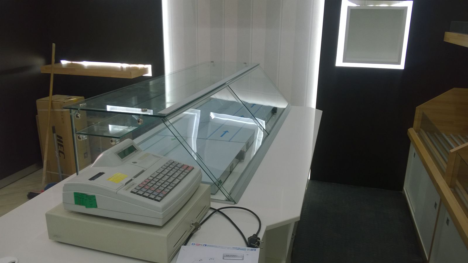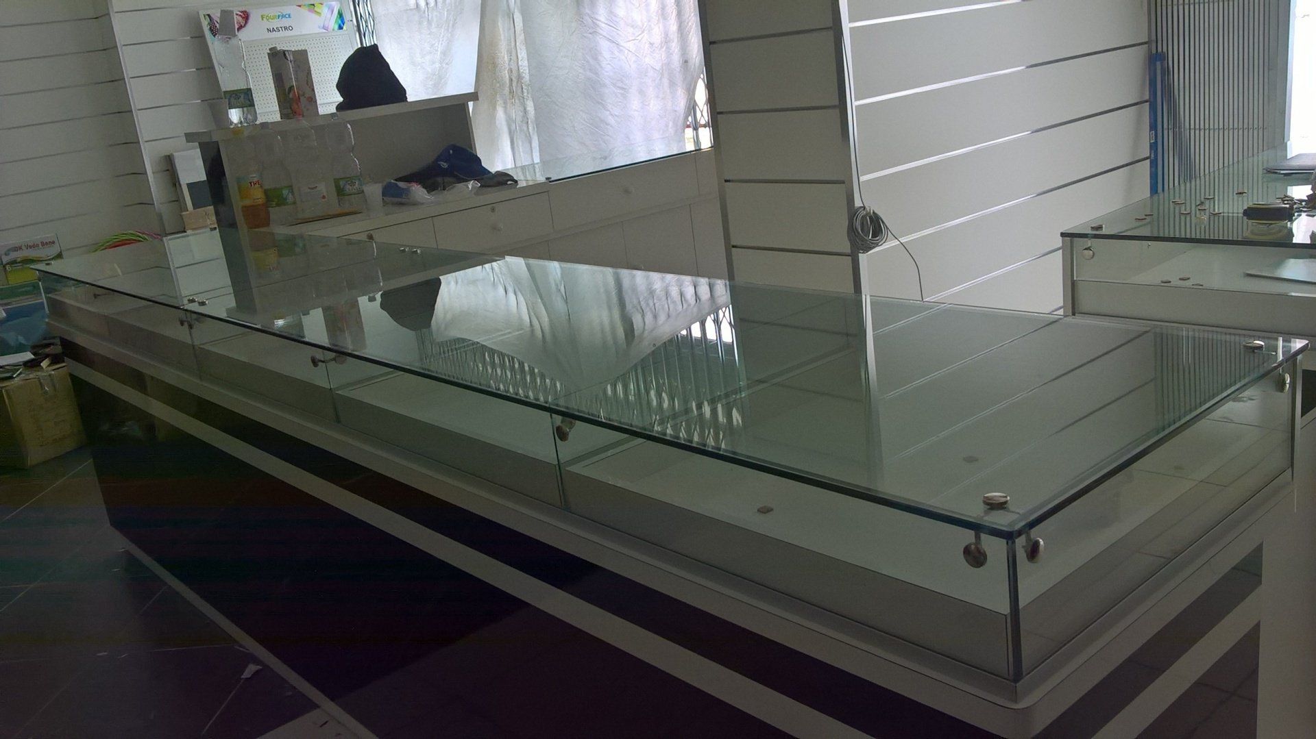 Bancone per negozio, in vetro extrachiaro 10 mm temperato, completo di paratie fisse, profili in alluminio satinato, ragnetti a tre bracci e copriforo in acciaio cromo-lucido.