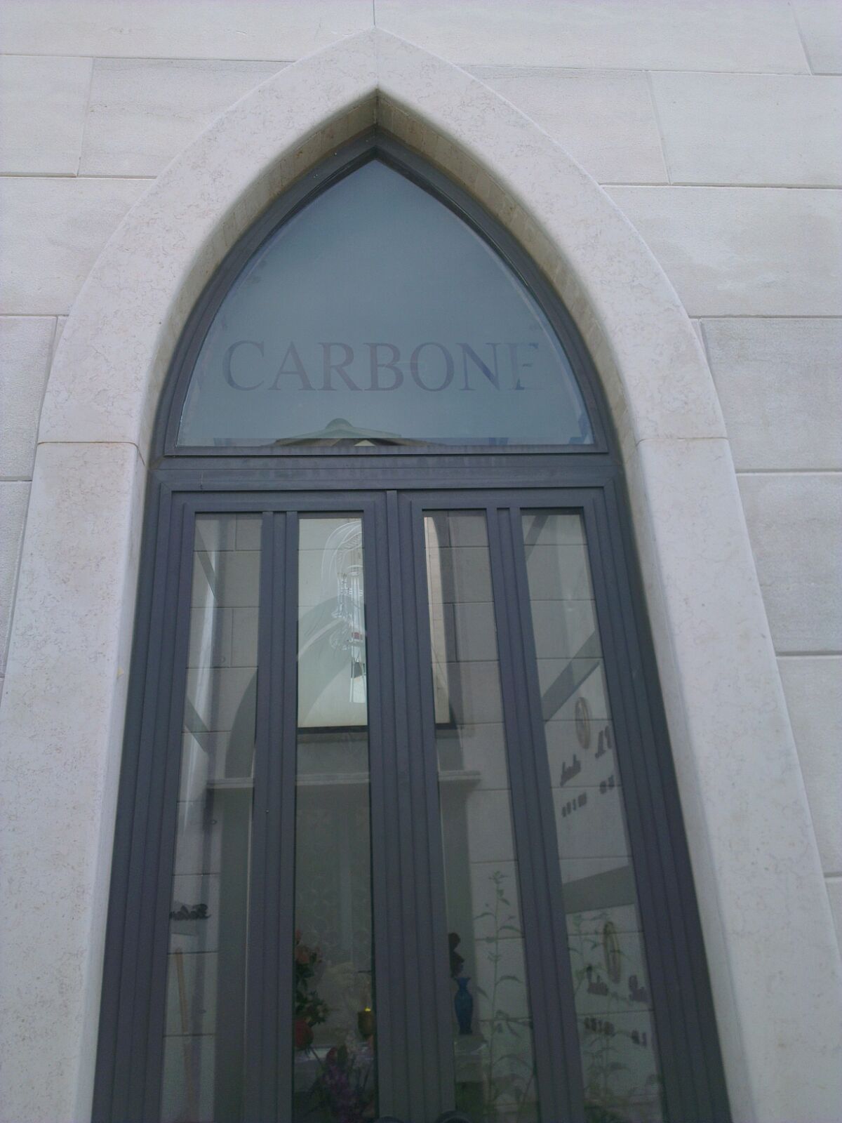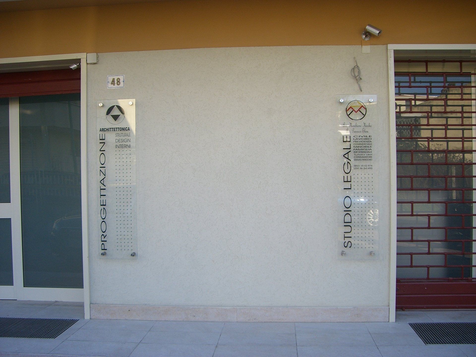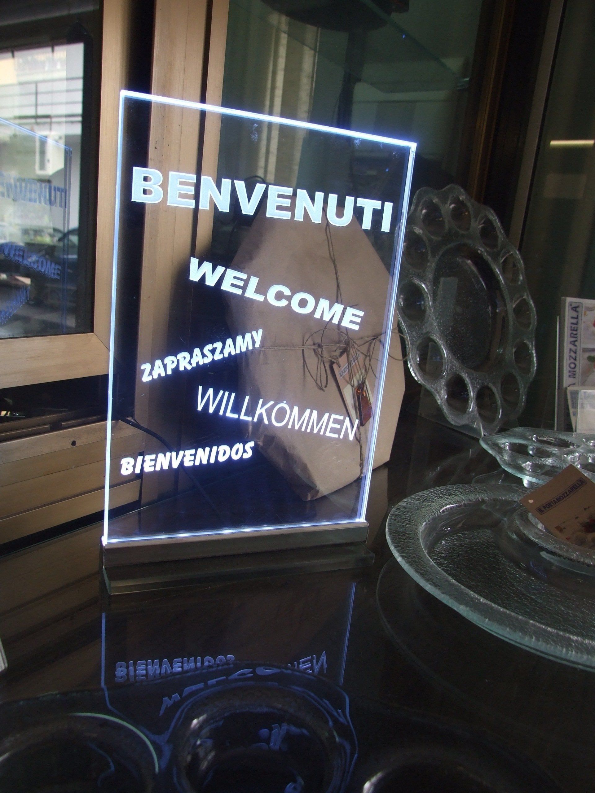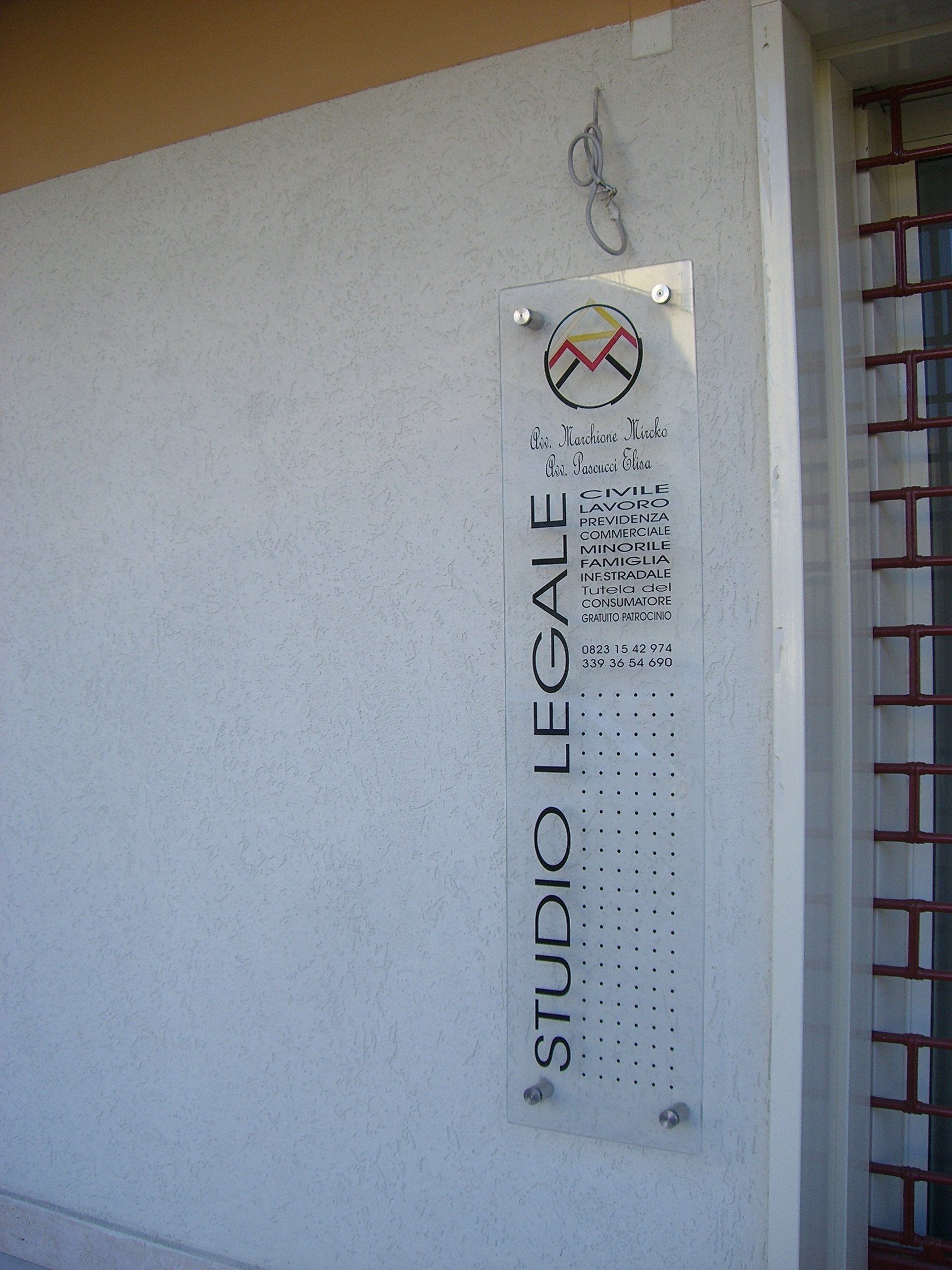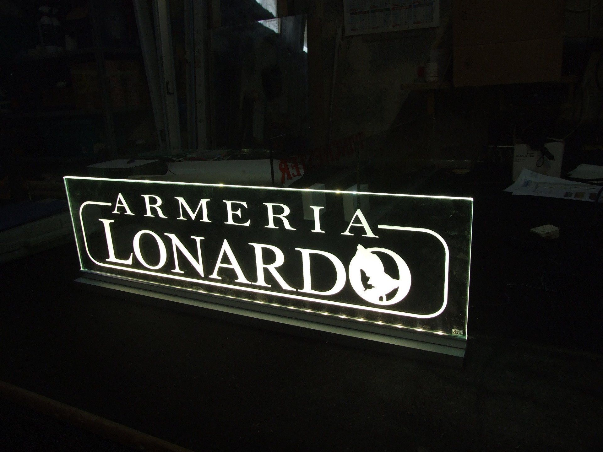 Targa pubblicitaria in vetro extrachiaro 8 mm temperato con decoro sabbiato, strip led e base in alluminio satinato. Realizzata per "Armeria Lonardo", Teano (CE).
