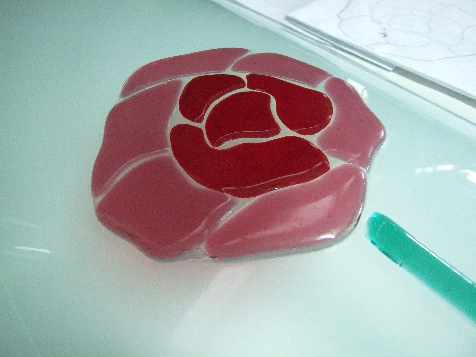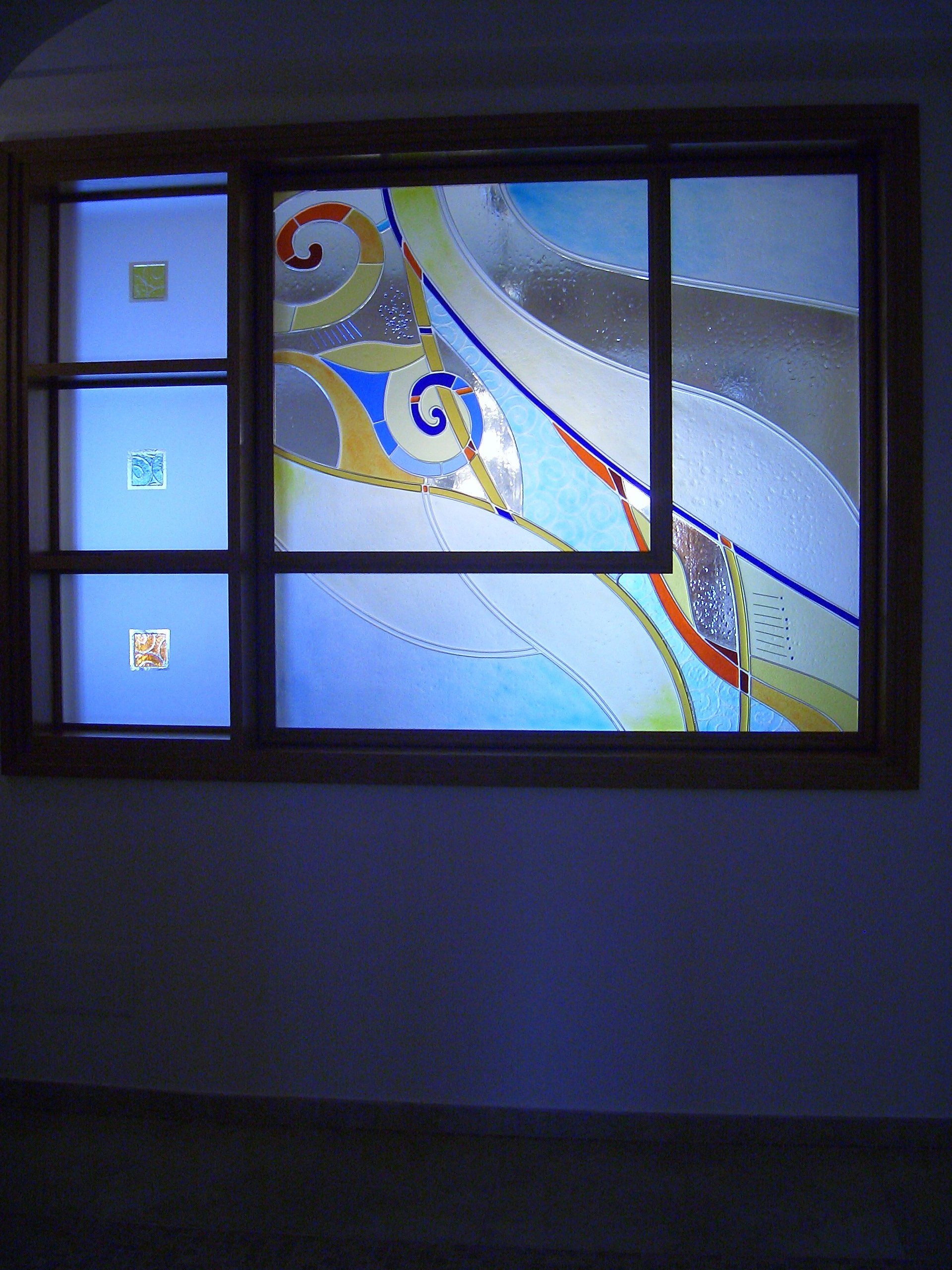Vetrata in vetro fuso, realizzata su commissione. Progettata nel nostro laboratorio e cotta nel nostro forno fusione.