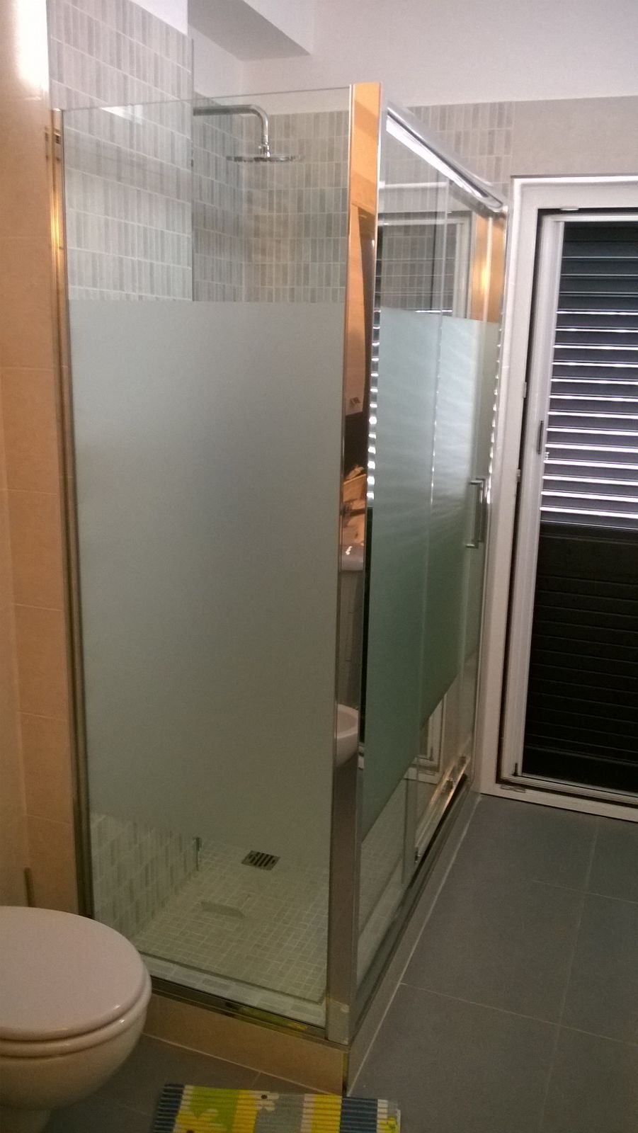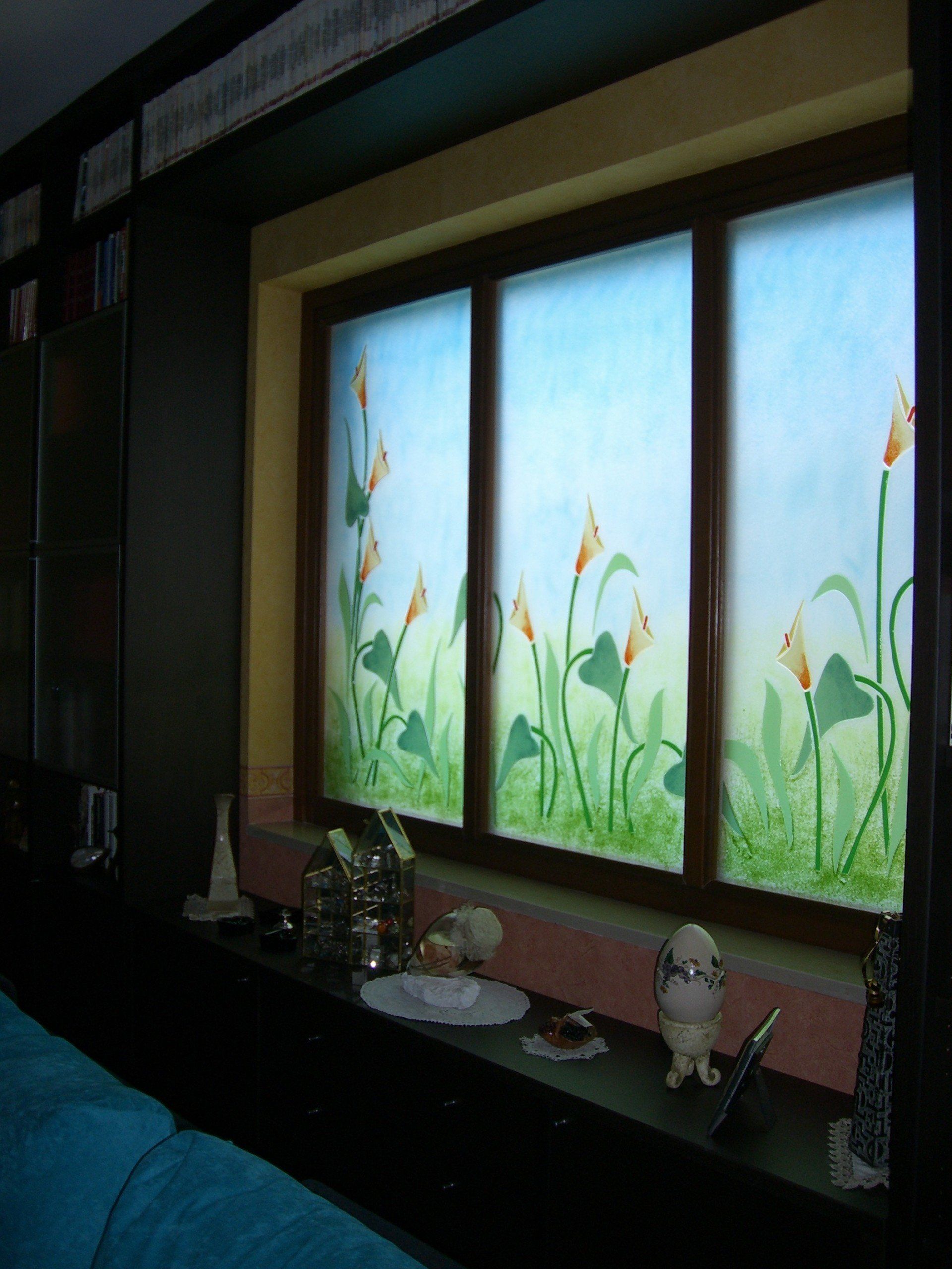 Vetro 5 mm satinato e temperato con decoro floreale sabbiato.