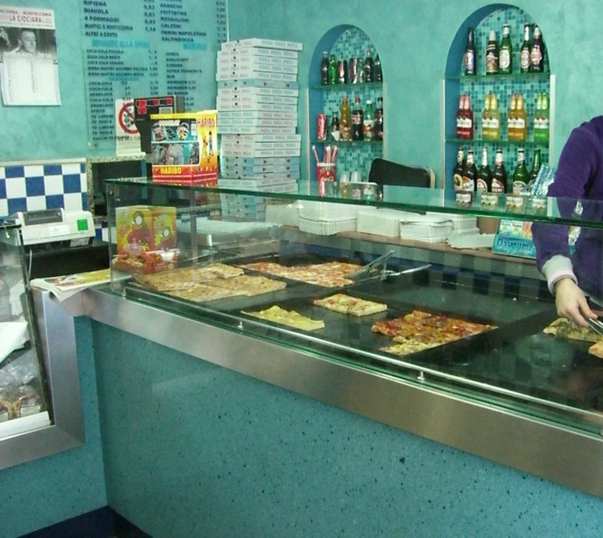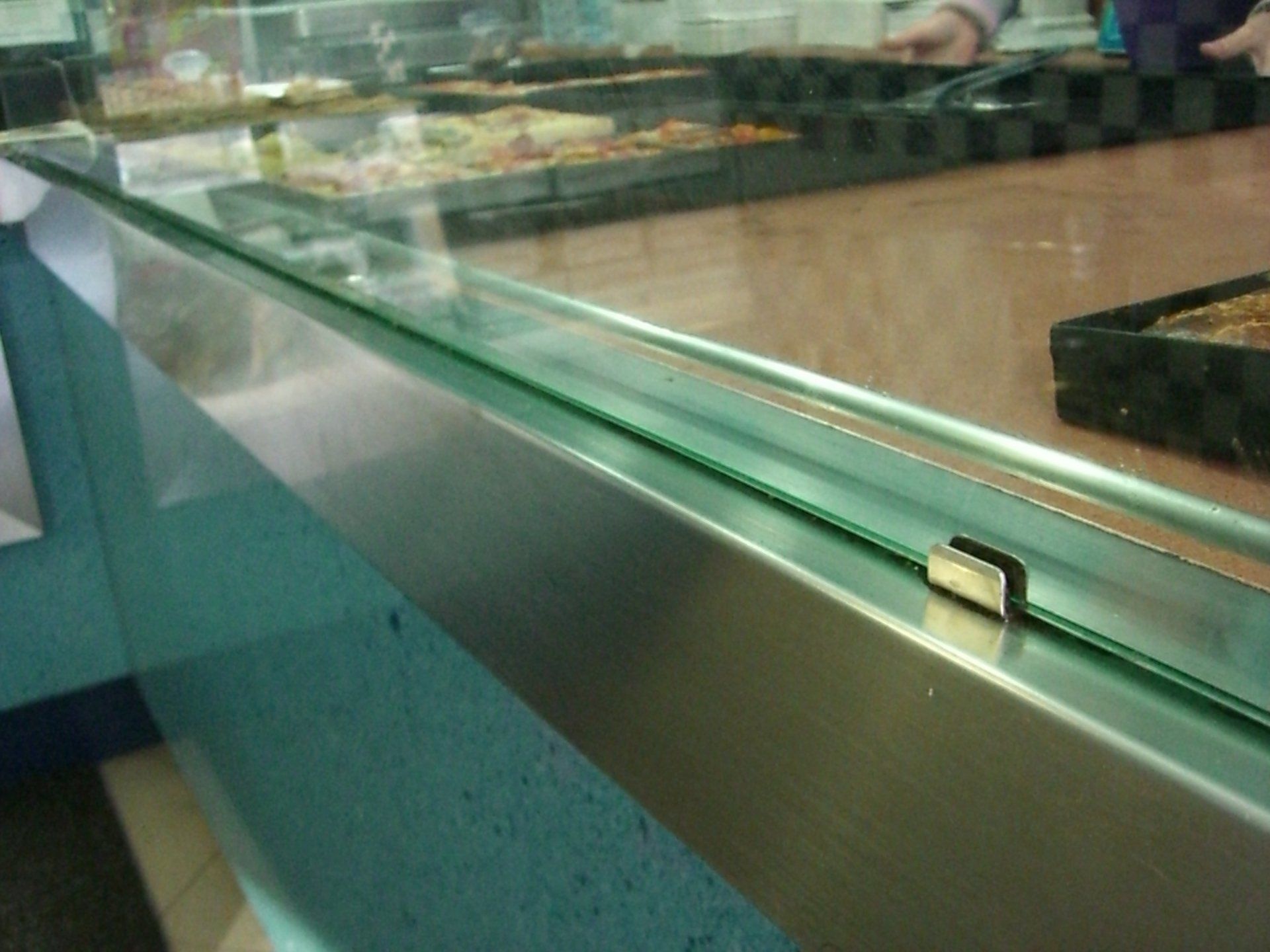Bancone per pizzeria in vetro extrachiaro 10 mm temperato, con ragnetti di fissaggio a tre vie e profilo in acciaio lucido.