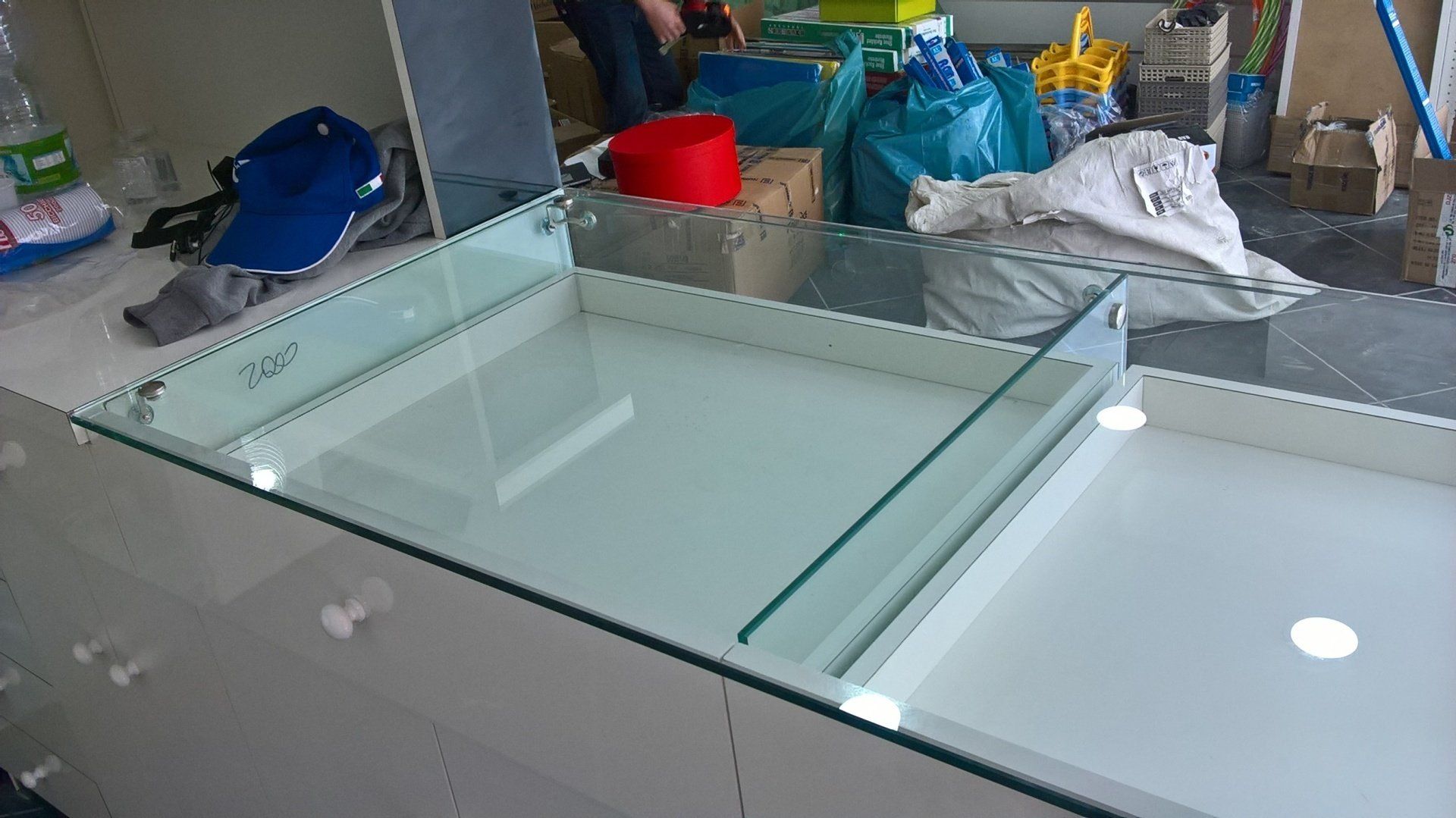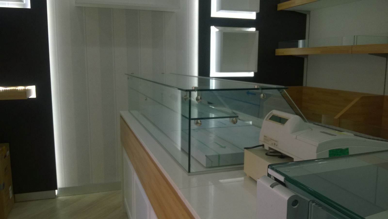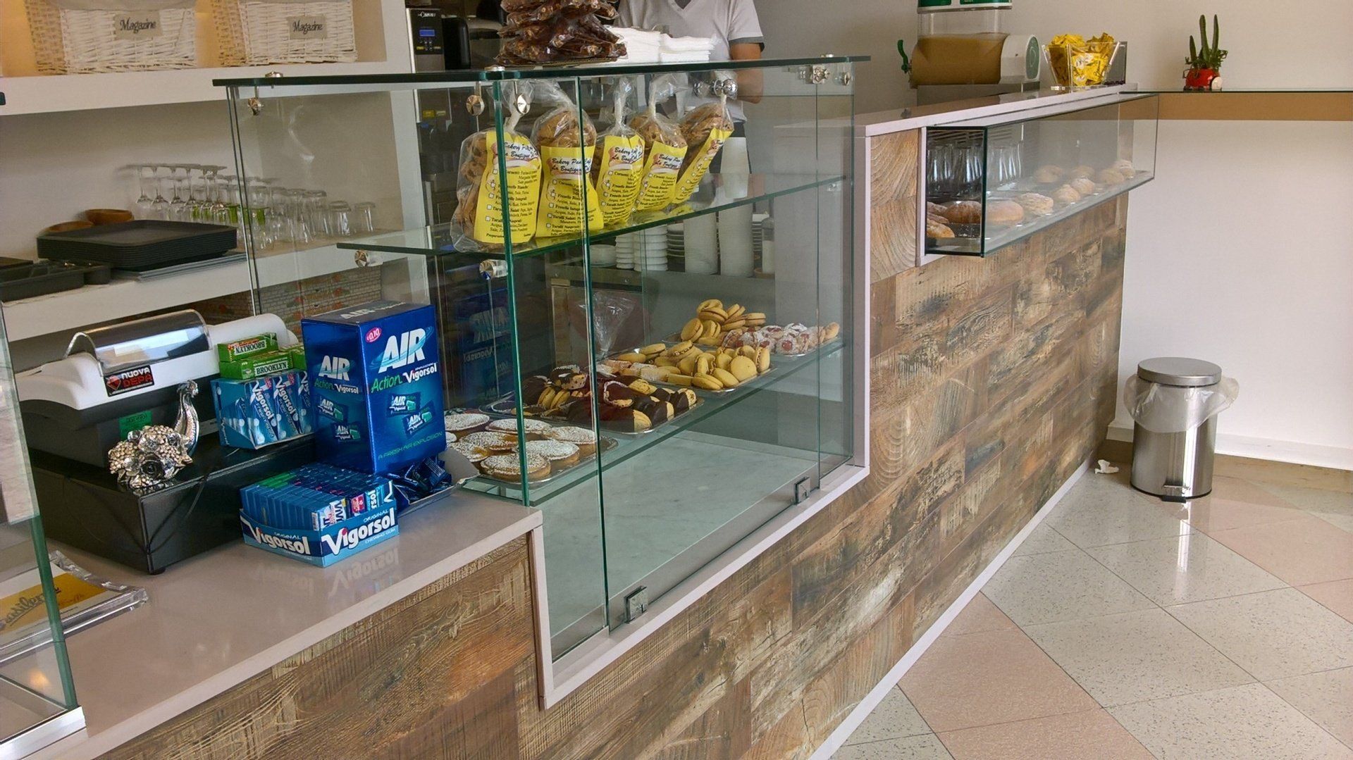 Vetrina a sbalzo per panetteria, in vetro extrachiaro 10 mm temperato, incollata con raggi UV.