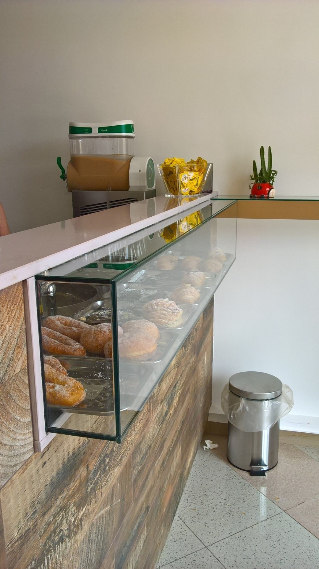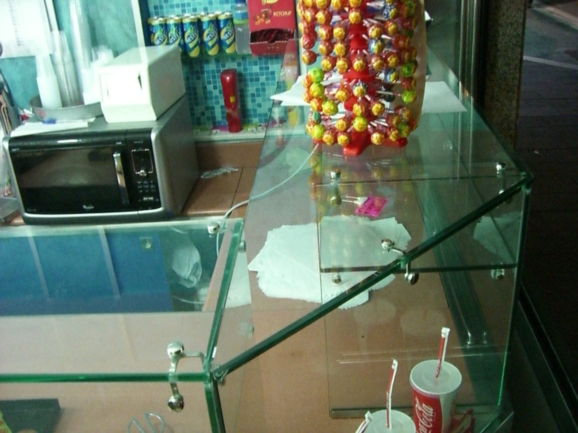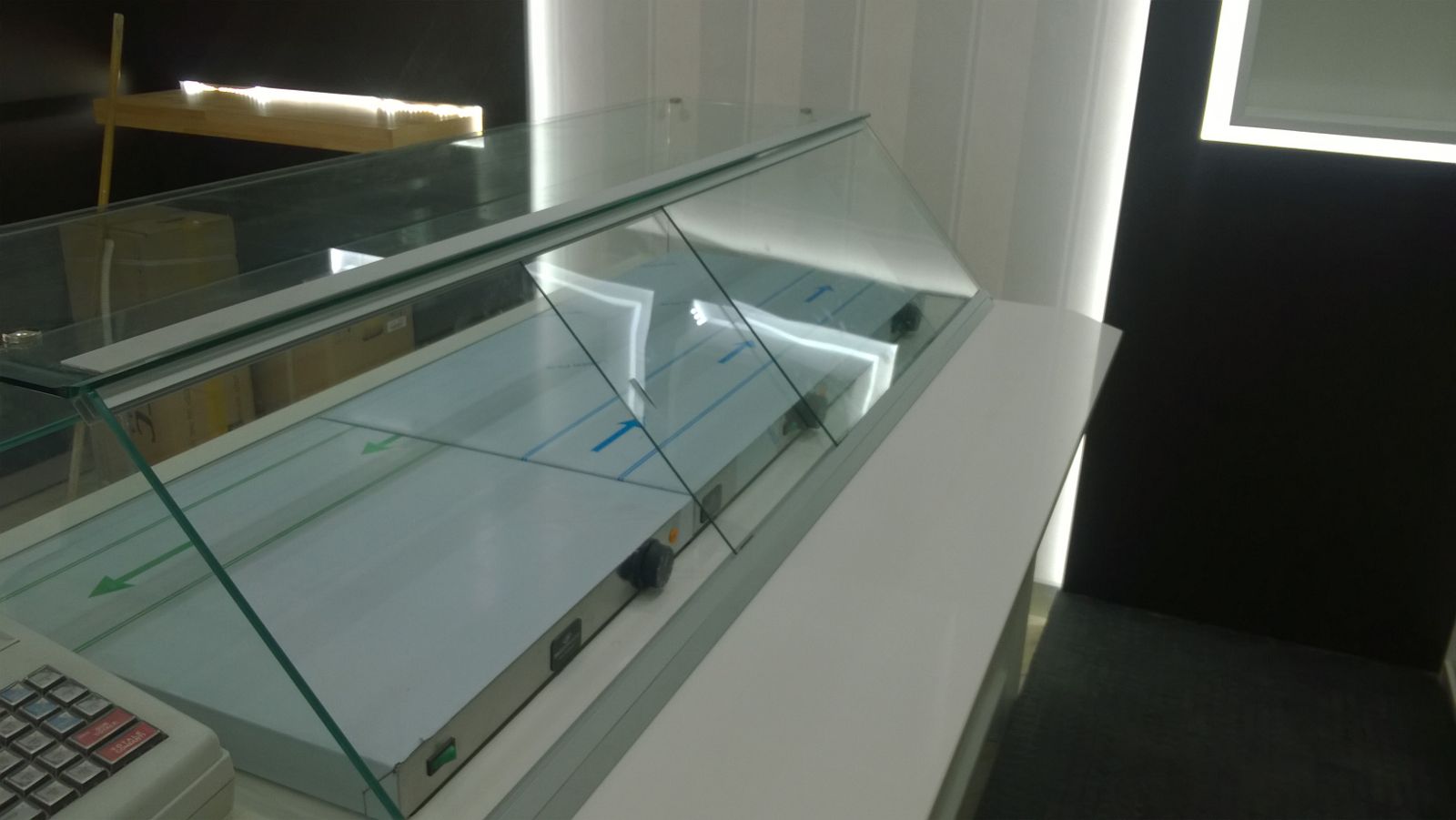 Vetrina a sbalzo per panetteria, in vetro extrachiaro 10 mm temperato, incollata con raggi UV.