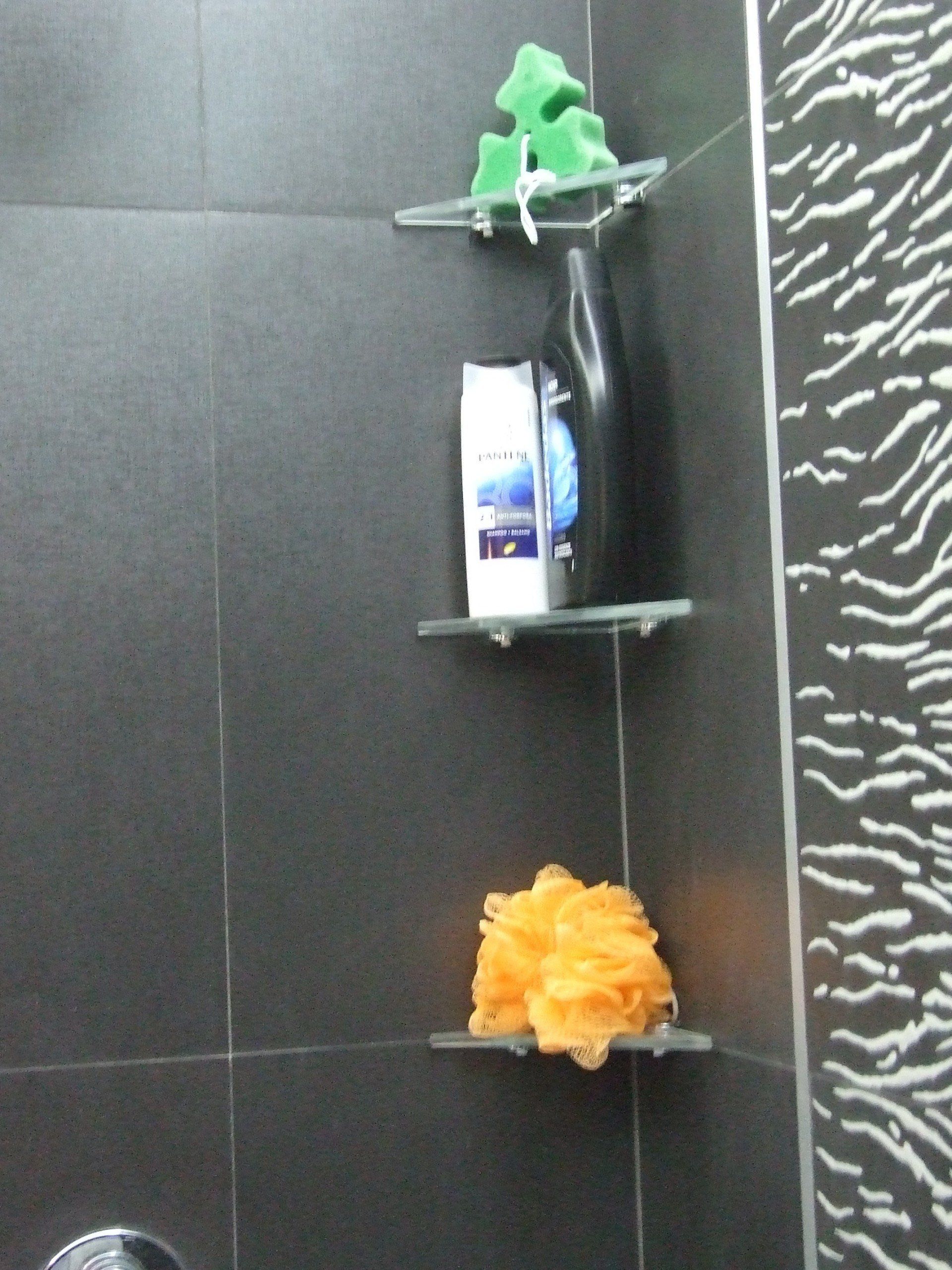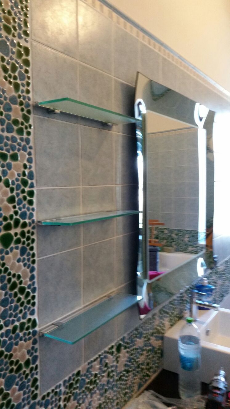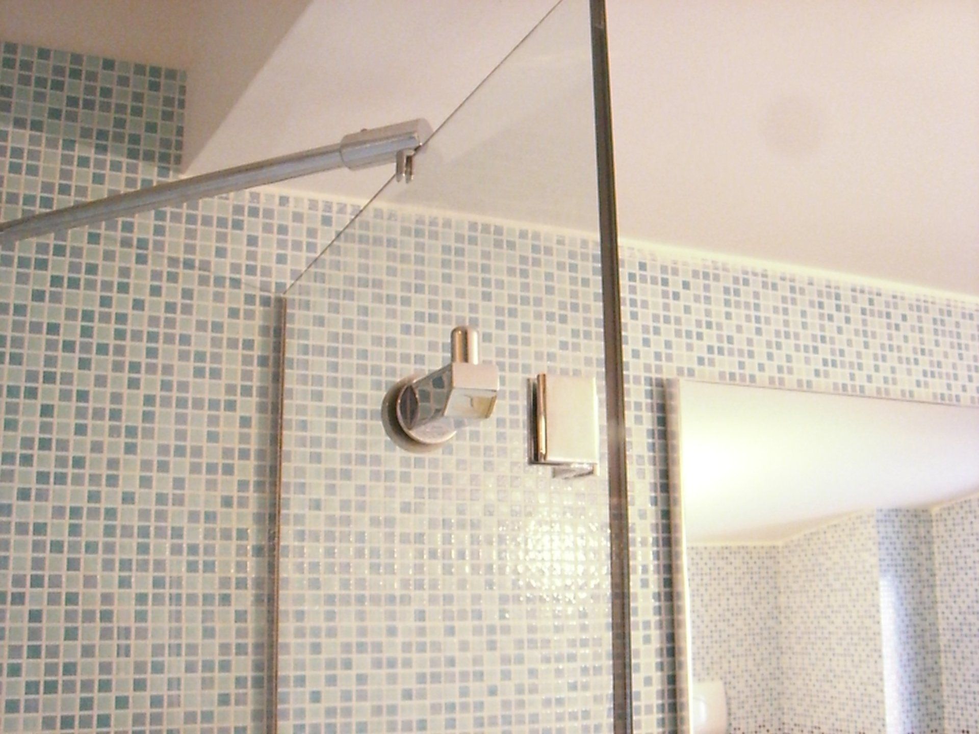 Mensole per doccia in vetro extrachiaro 8 mm con morsetti in acciaio cromo-lucido.