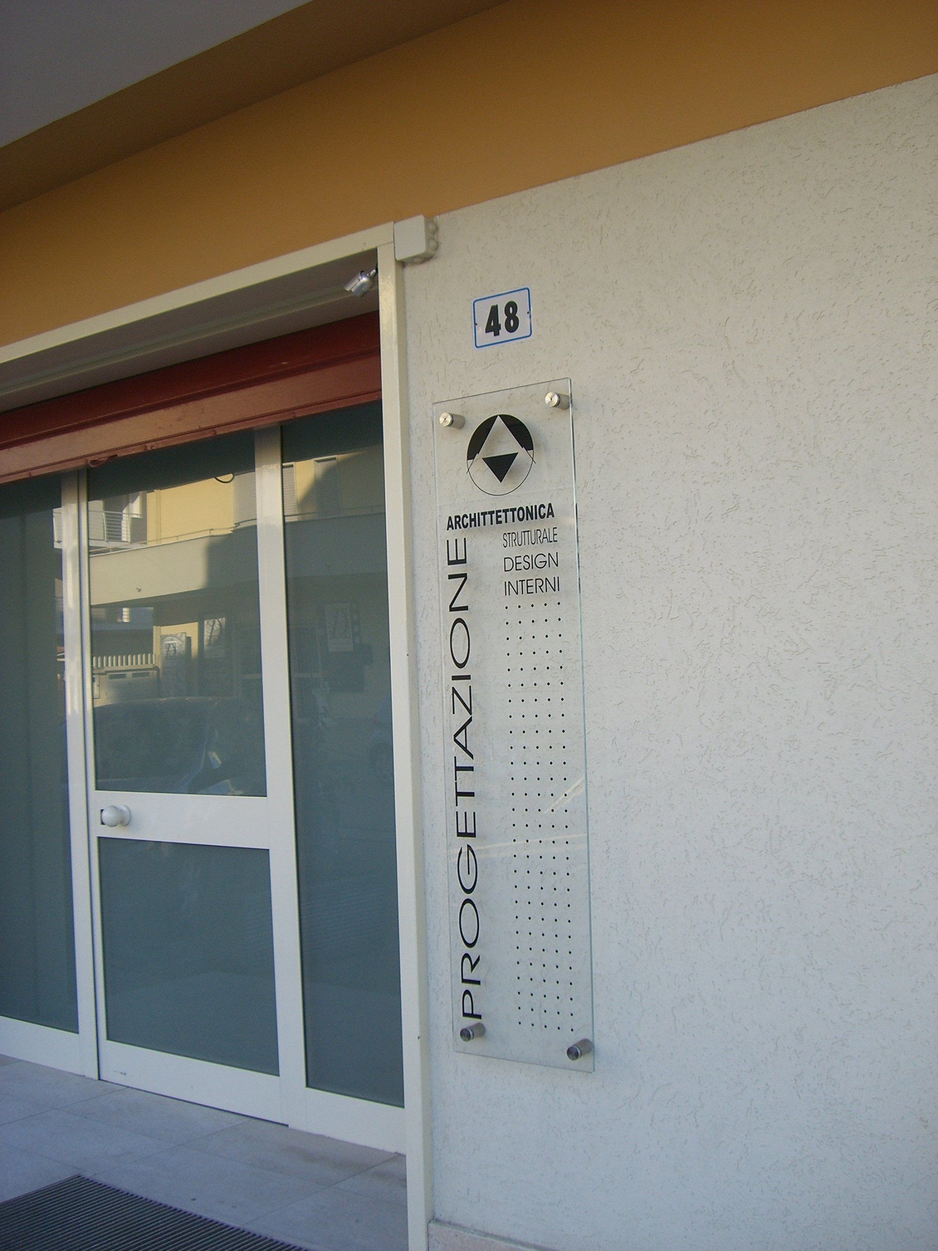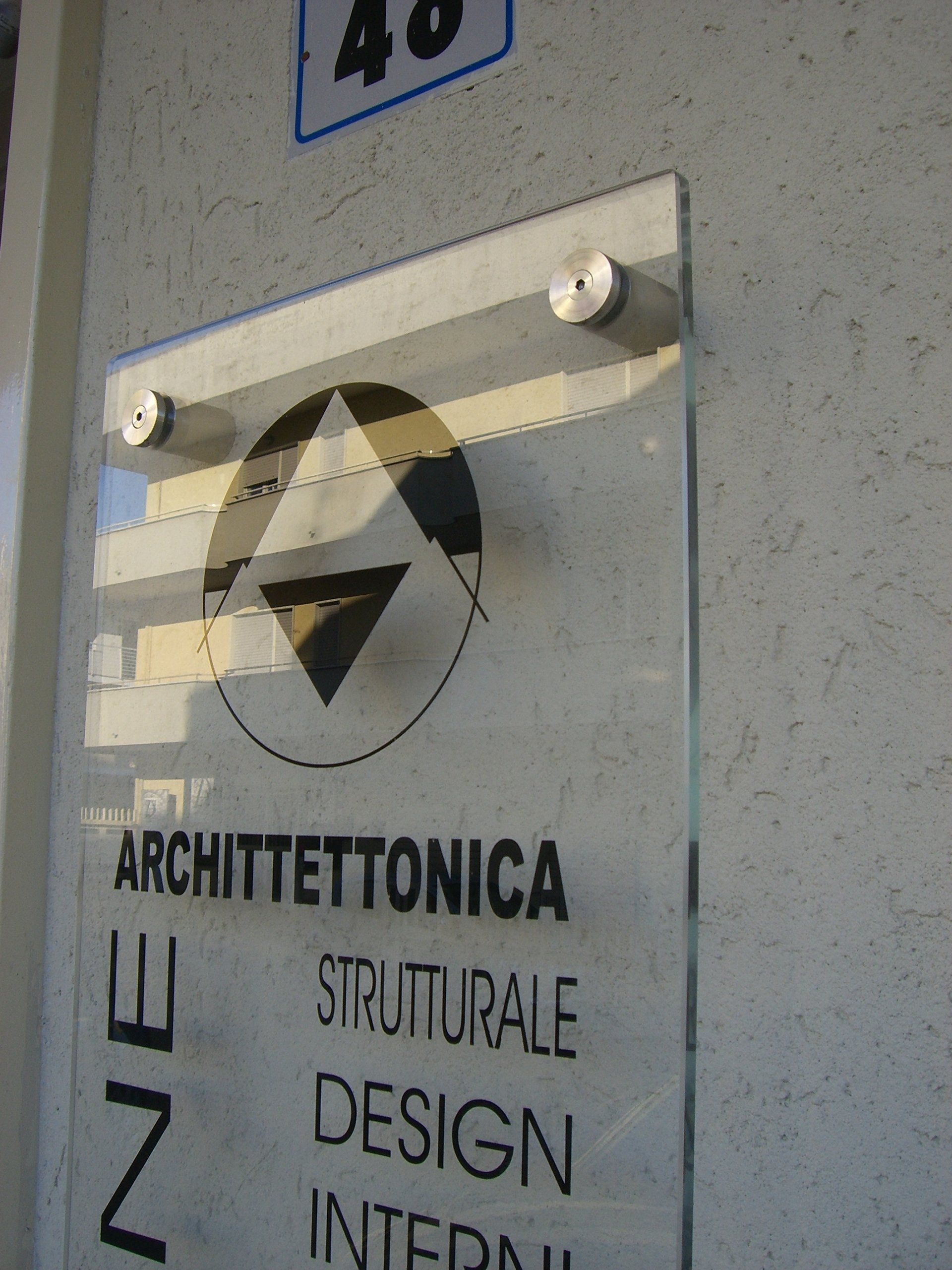 Tabella pubblicitaria in vetro extrachiaro 10 mm temperato, decorata a mano, con distanziali in acciaio cromo-lucido.