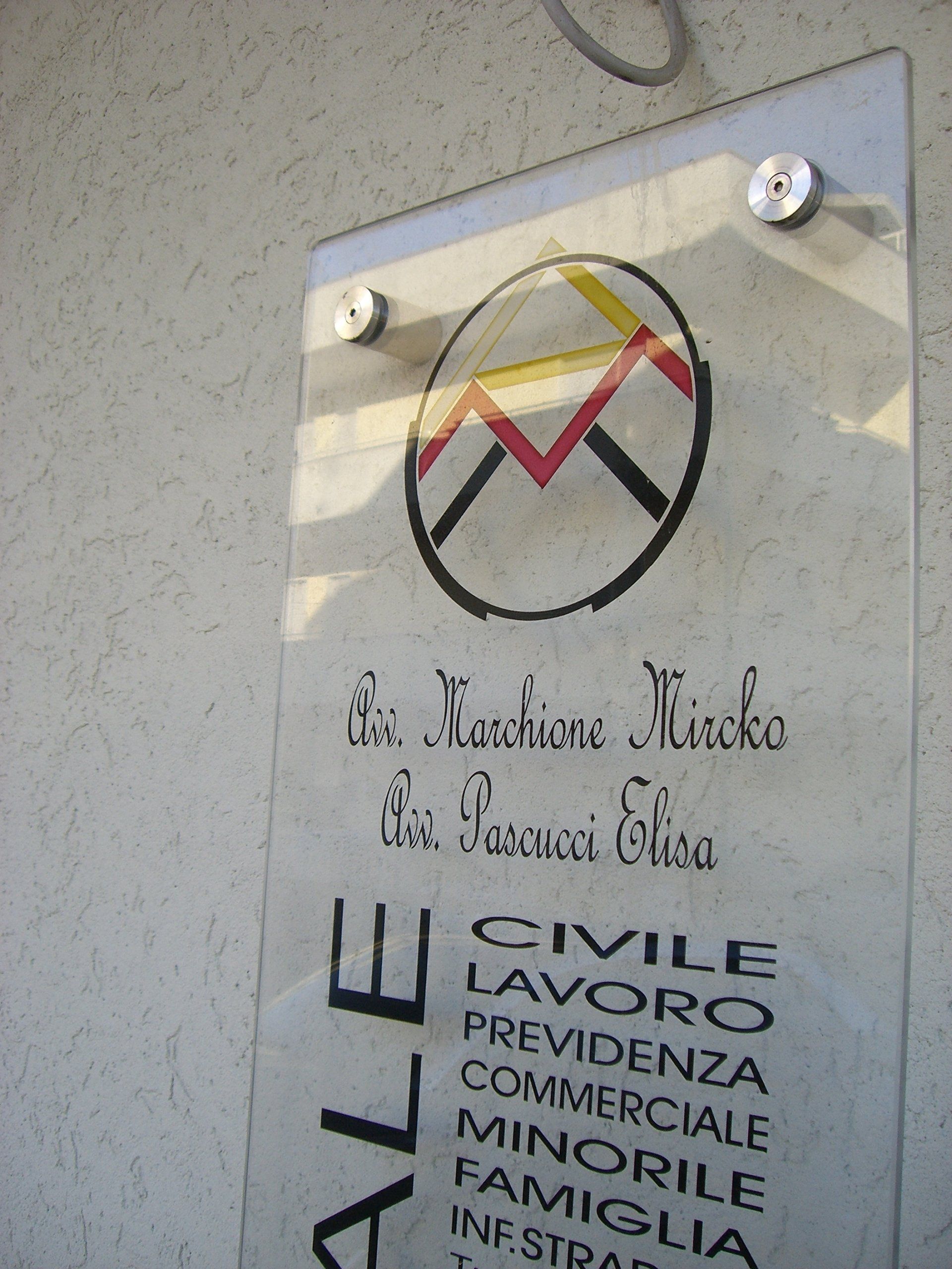 Tabelle pubblicitarie in vetro extrachiaro 10 mm temperato, decorata a mano, con distanziali in acciaio cromo-lucido.