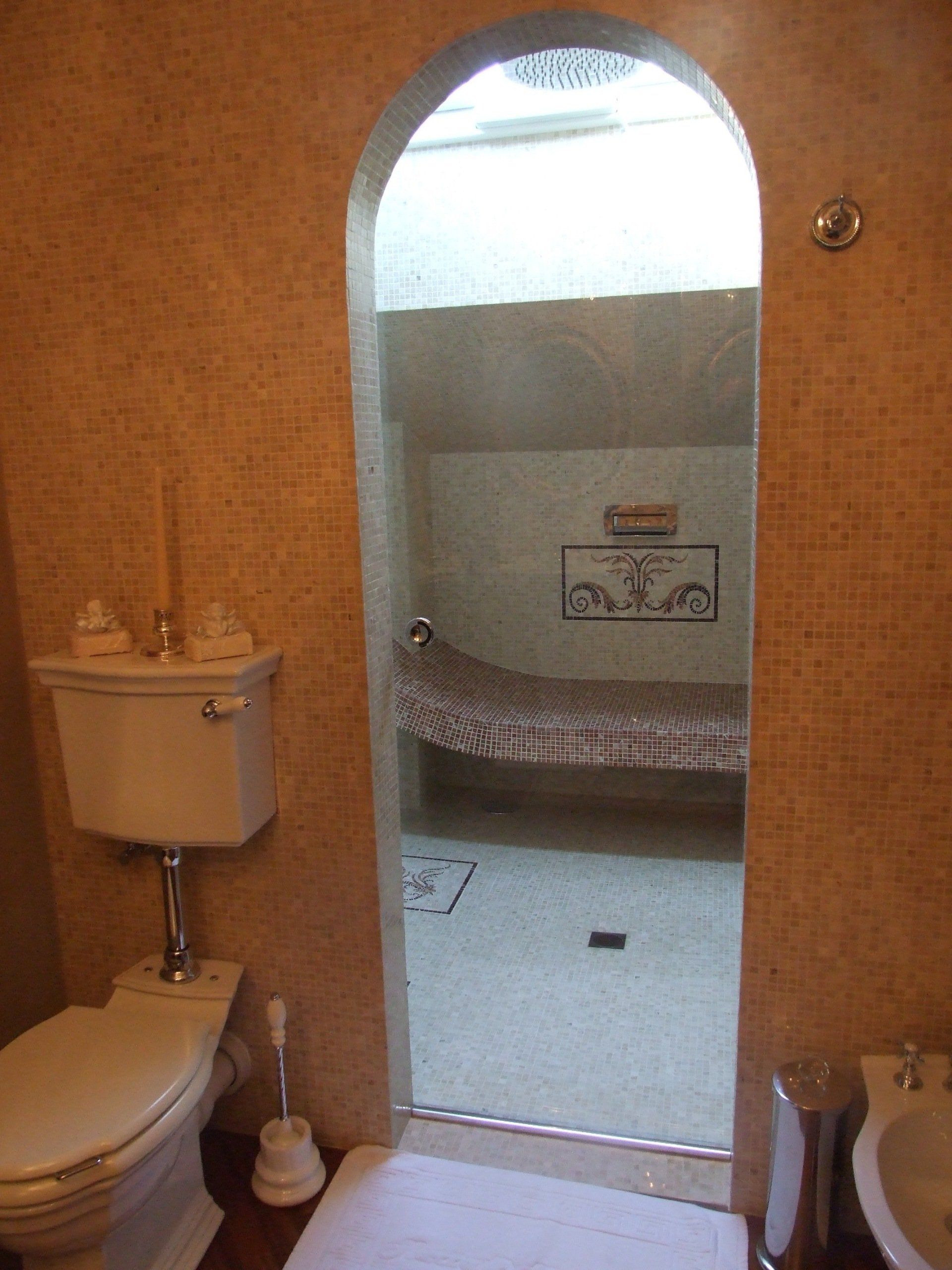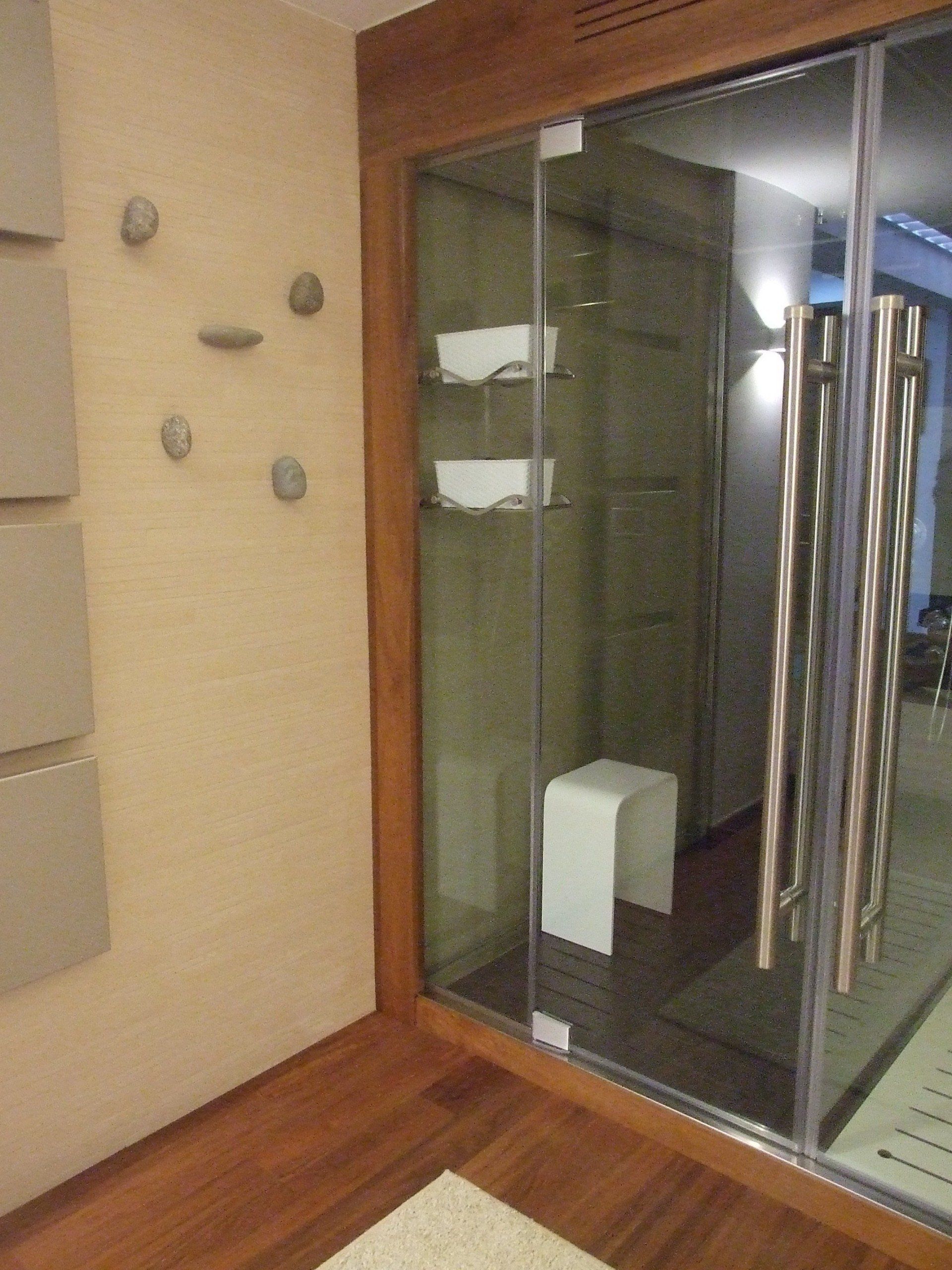 Porta scorrevole per sauna in vetro extrachiaro 8 mm temperato con pinze, profili e accessori in acciaio cromo lucido. .
