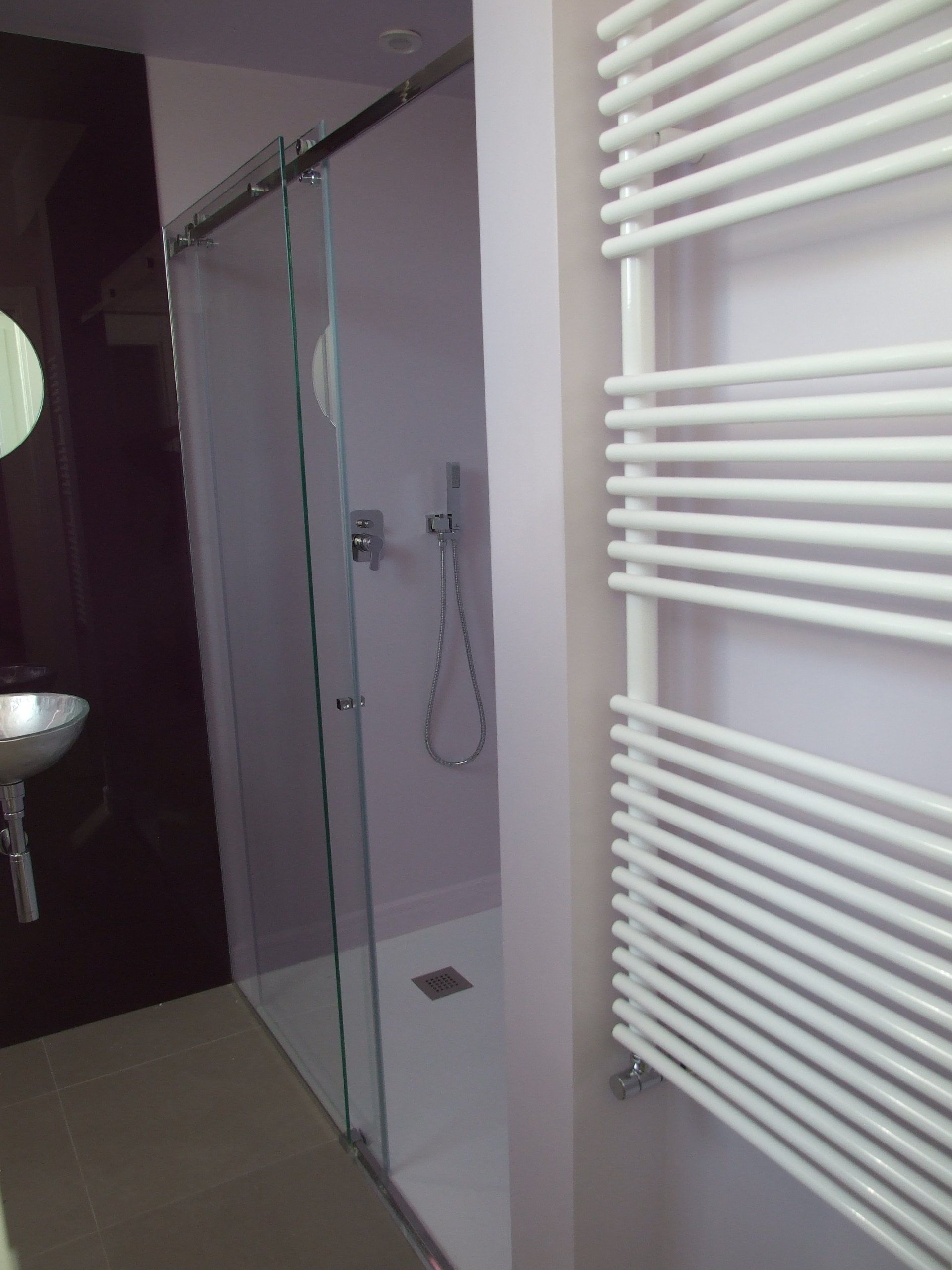 Box doccia con doppia anta scorrevole, in vetro extrachiaro 8 mm temperato, con binario e carrucole in acciaio cromo lucido.