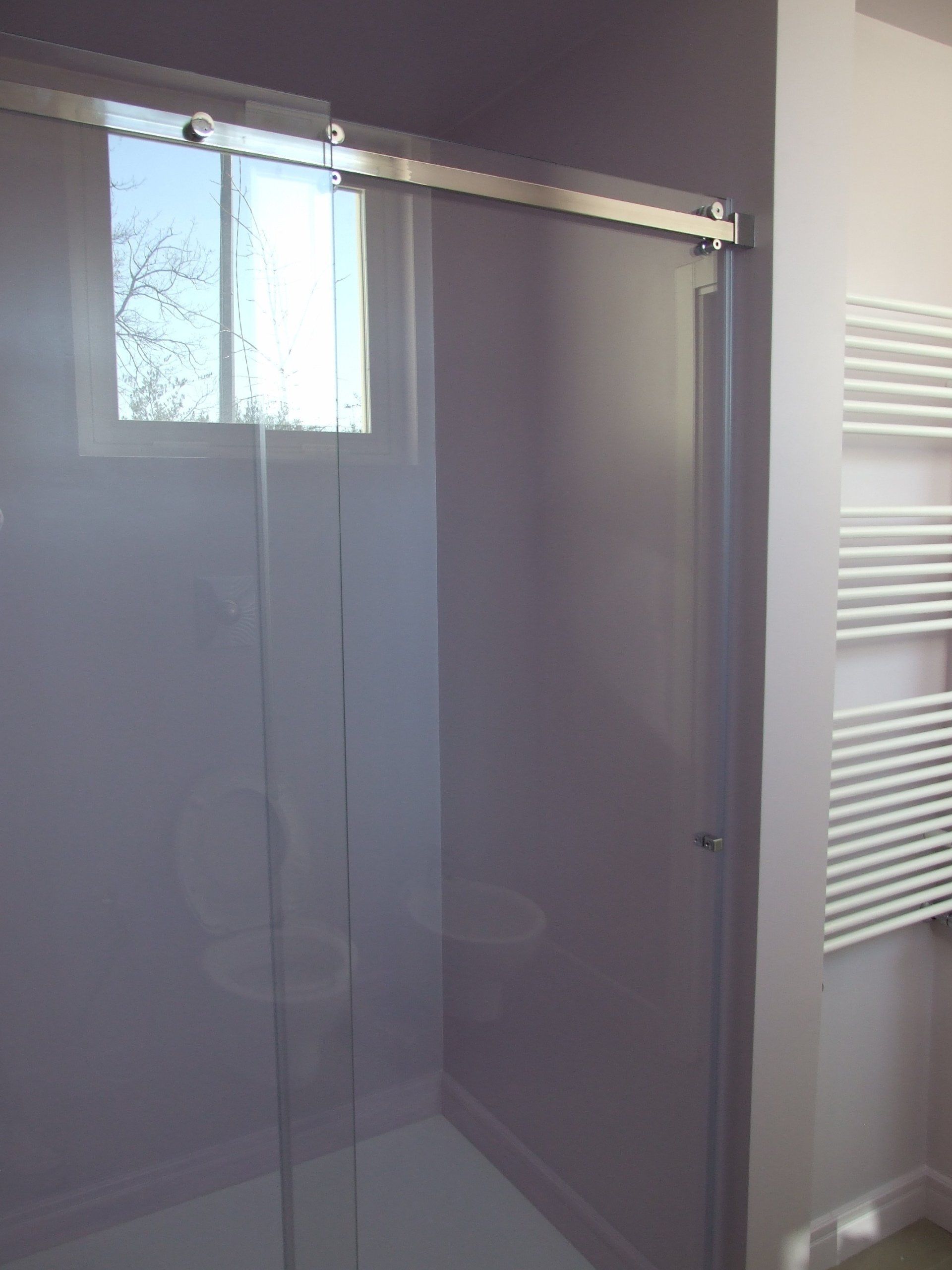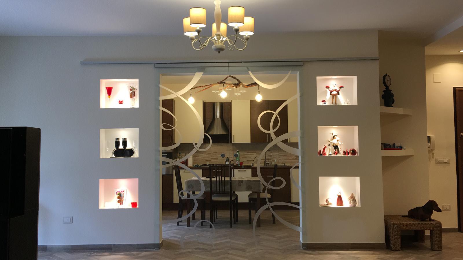 Doppia porta scorrevole in vetro temperato 8 mm extrachiaro con decoro sabbiato e trattamento antimacchia.