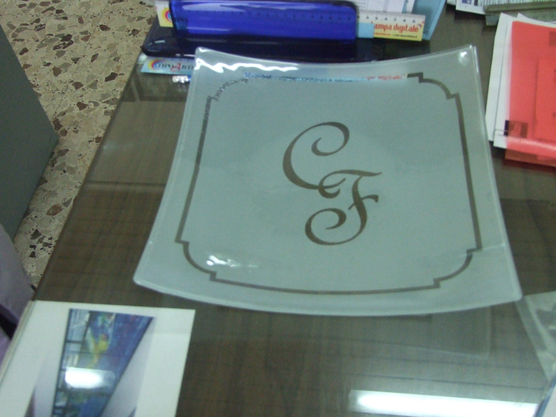 Targa commemorativa in vetro extrachiaro 8 mm temperato con decoro e scritta scavati.