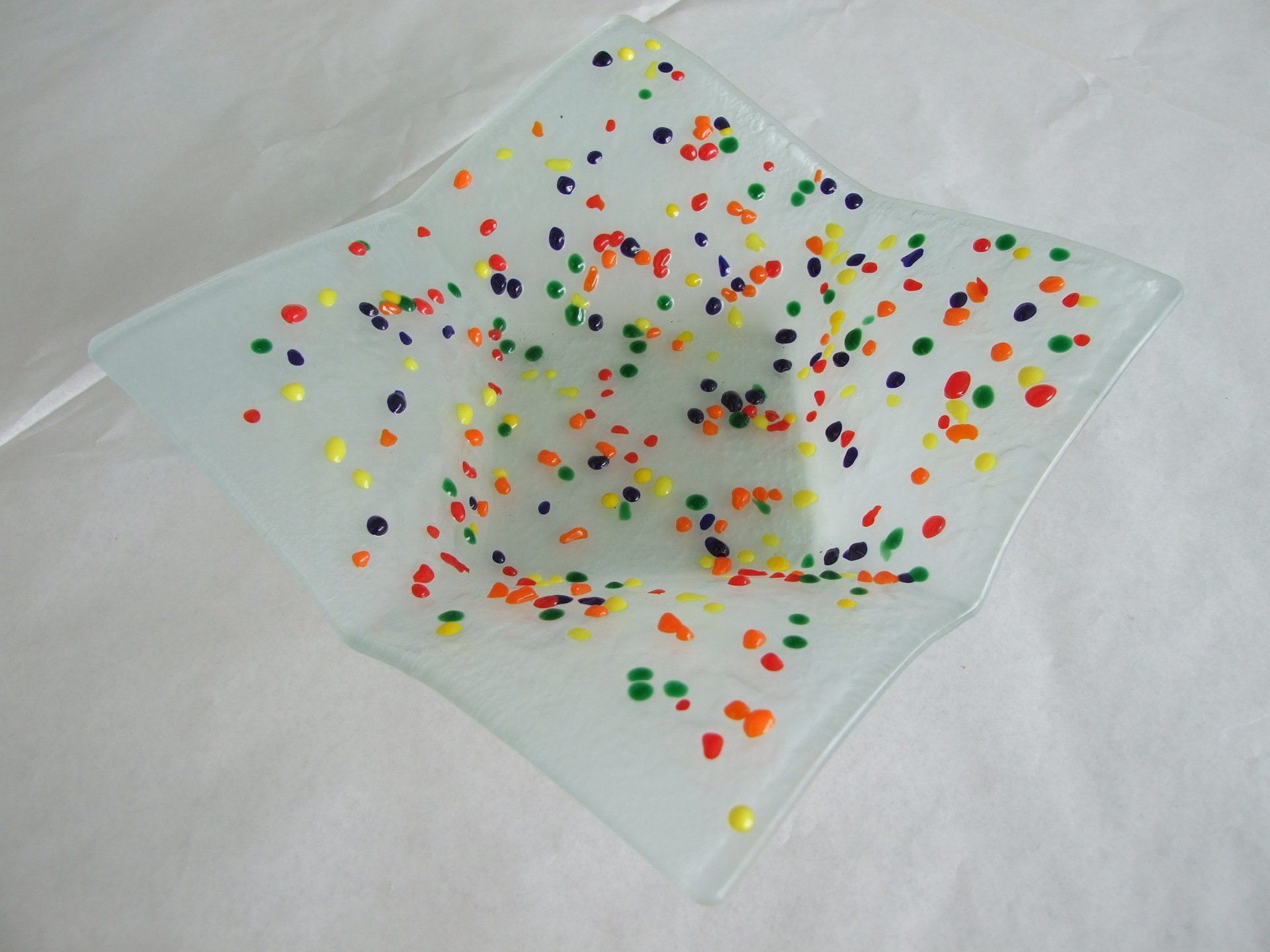 Centrotavola in vetro 6 mm extrachiaro con scaglie multicolore.