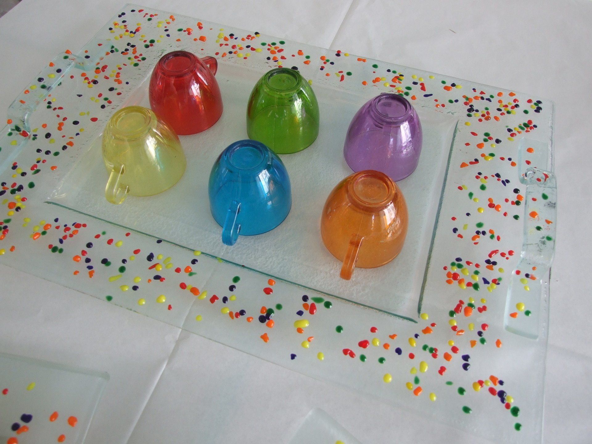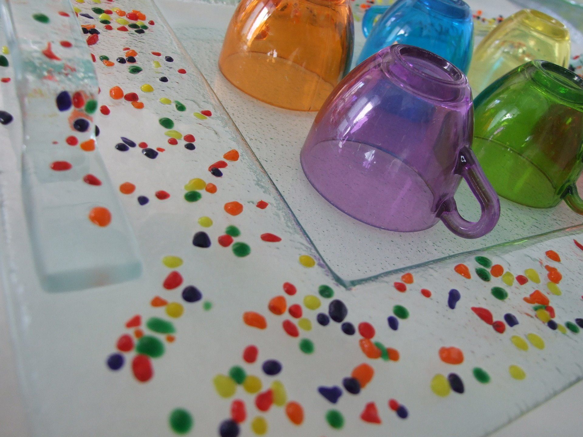 Portatazzine in vetro 6 mm extrachiaro con scaglie multicolore.