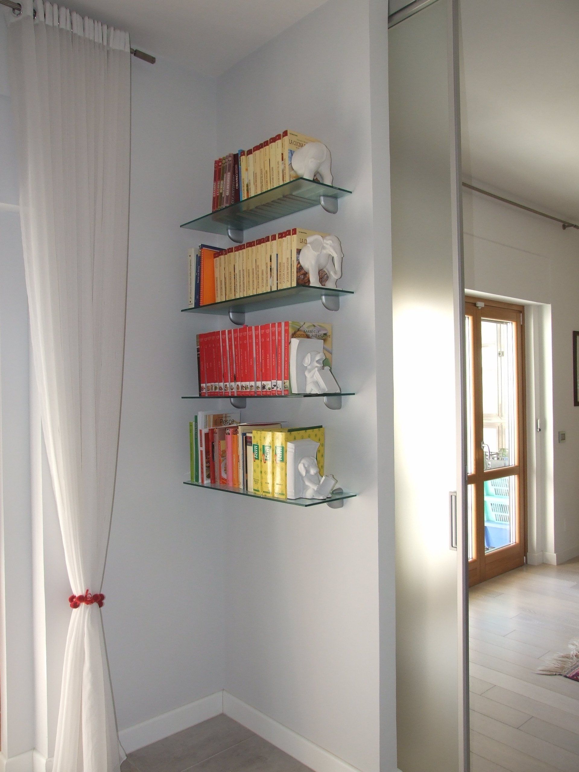 Mensole in vetro extrachiaro 8 mm temperato con morsetti tucano in acciaio satinato.