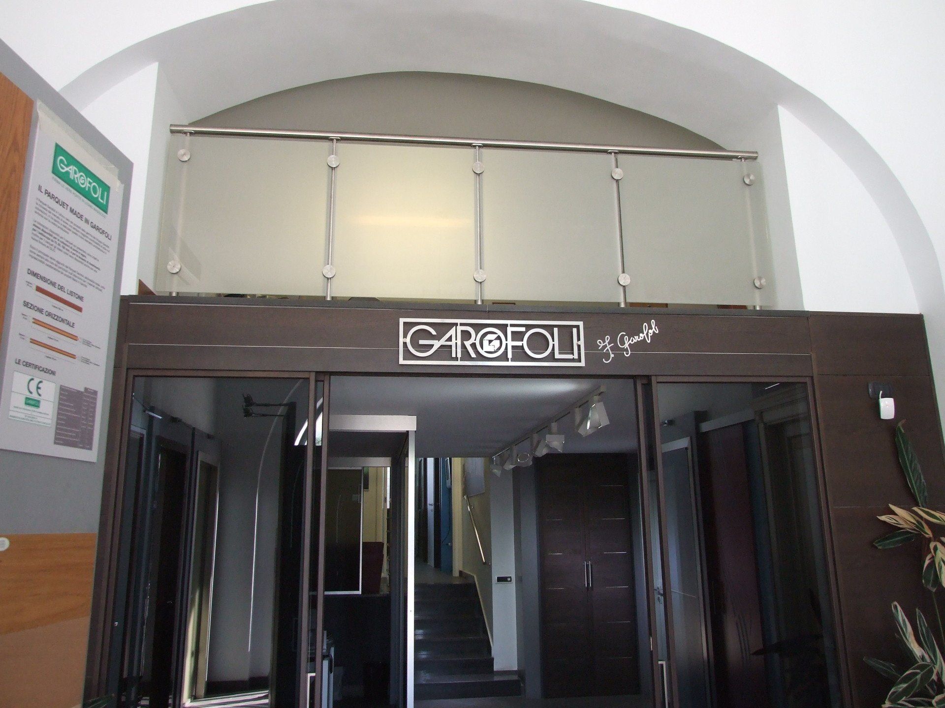 Doppia porta scorrevole in vetro temperato 10 mm con veletta in alluminio realizzata per il negozio Boccia Abbigliamento1944 Casapulla (CE).