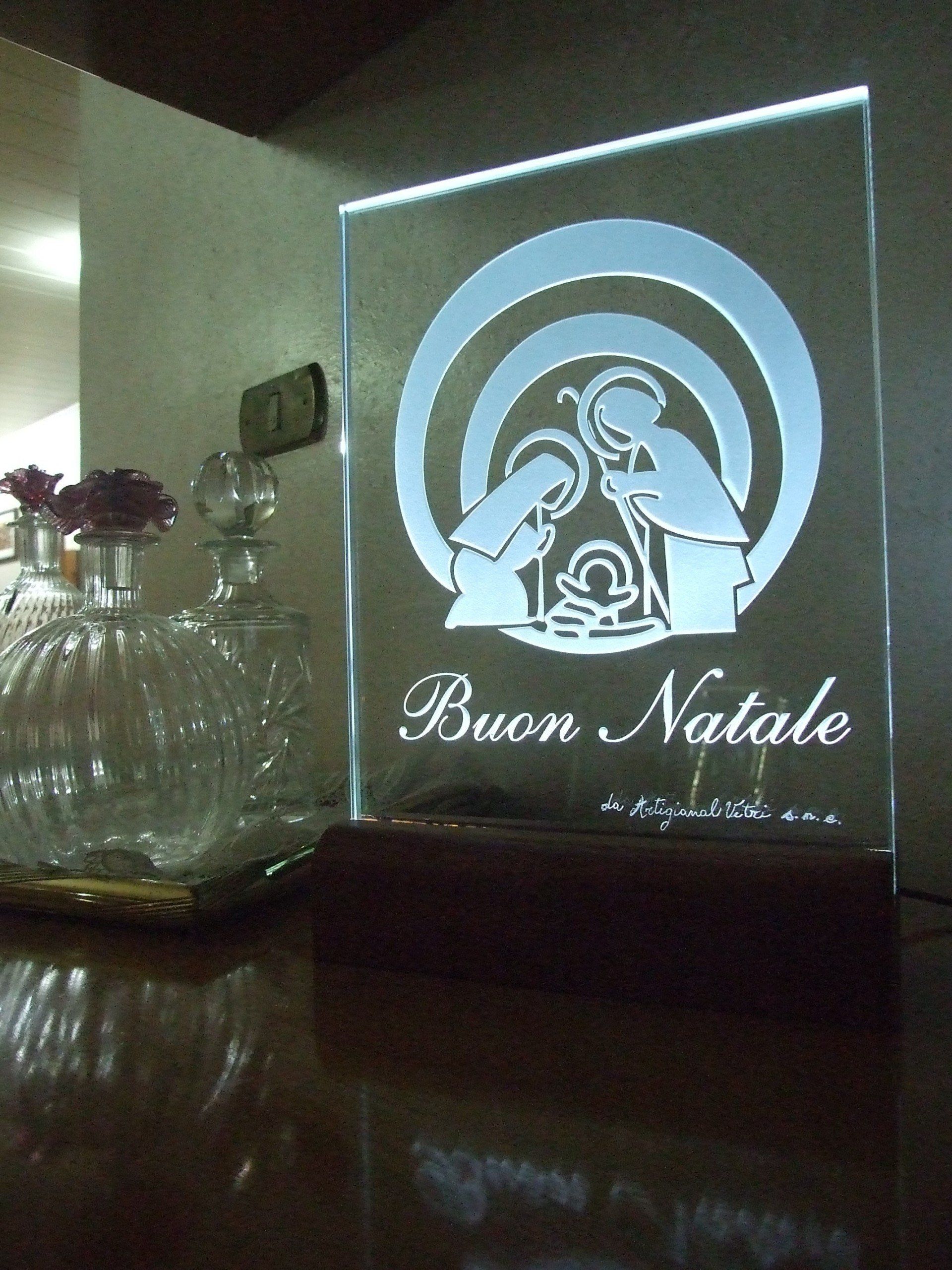 Targa in vetro extrachiaro 8 mm, con decoro scavato, strip led e base in legno. Realizzata in occasione delle festività natalizie.