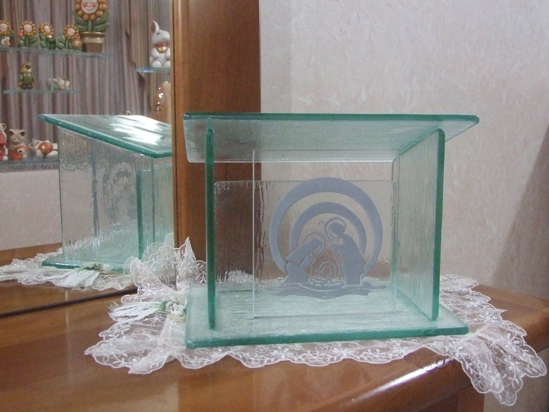Presepe con pannelli in vetro 5 mm extrachiaro con decoro sabbiato. Realizzato in occasione delle festività natalizie.