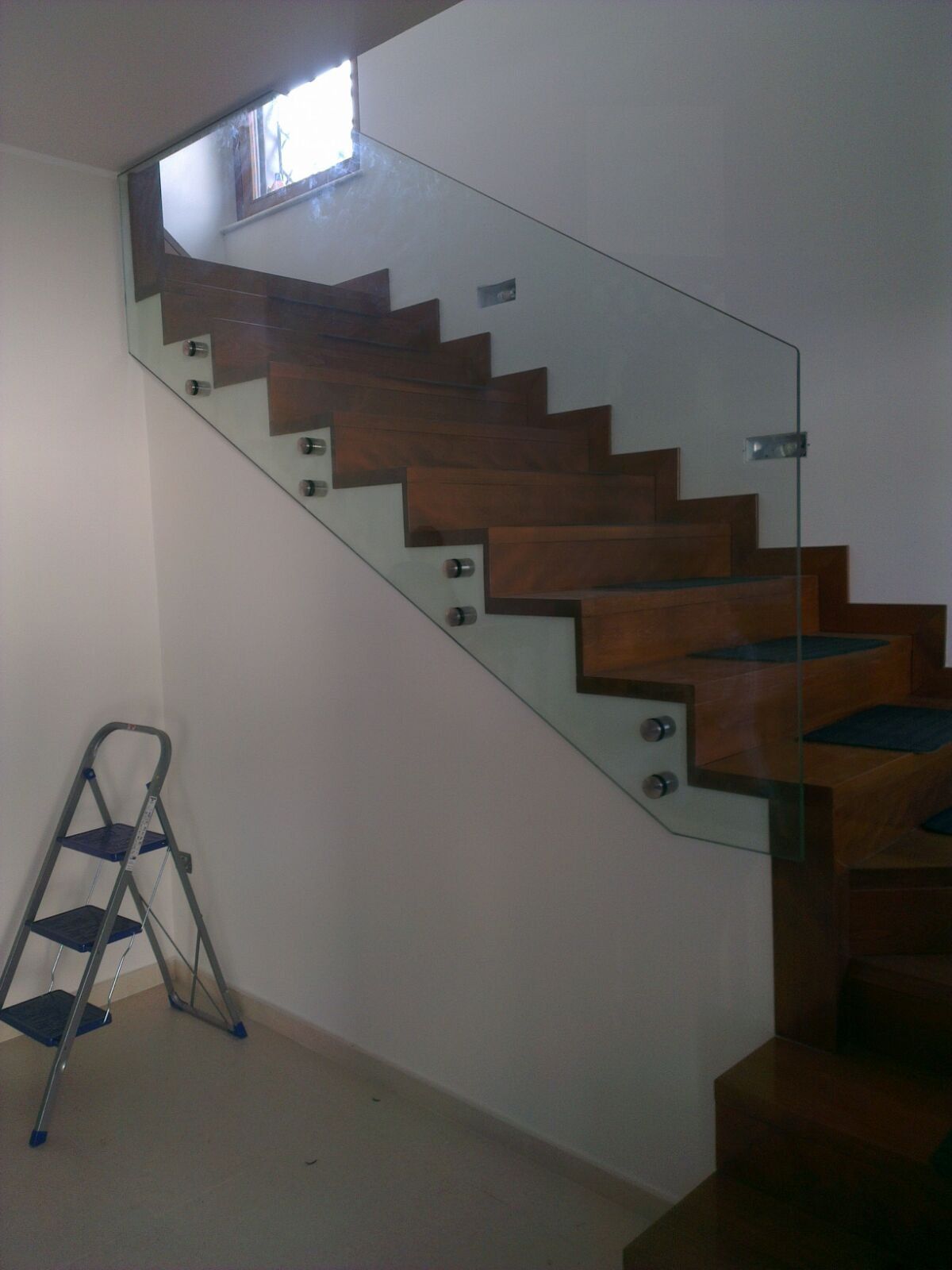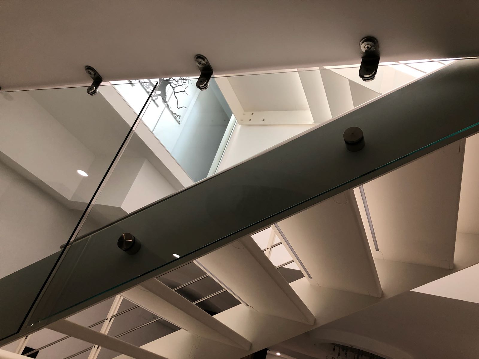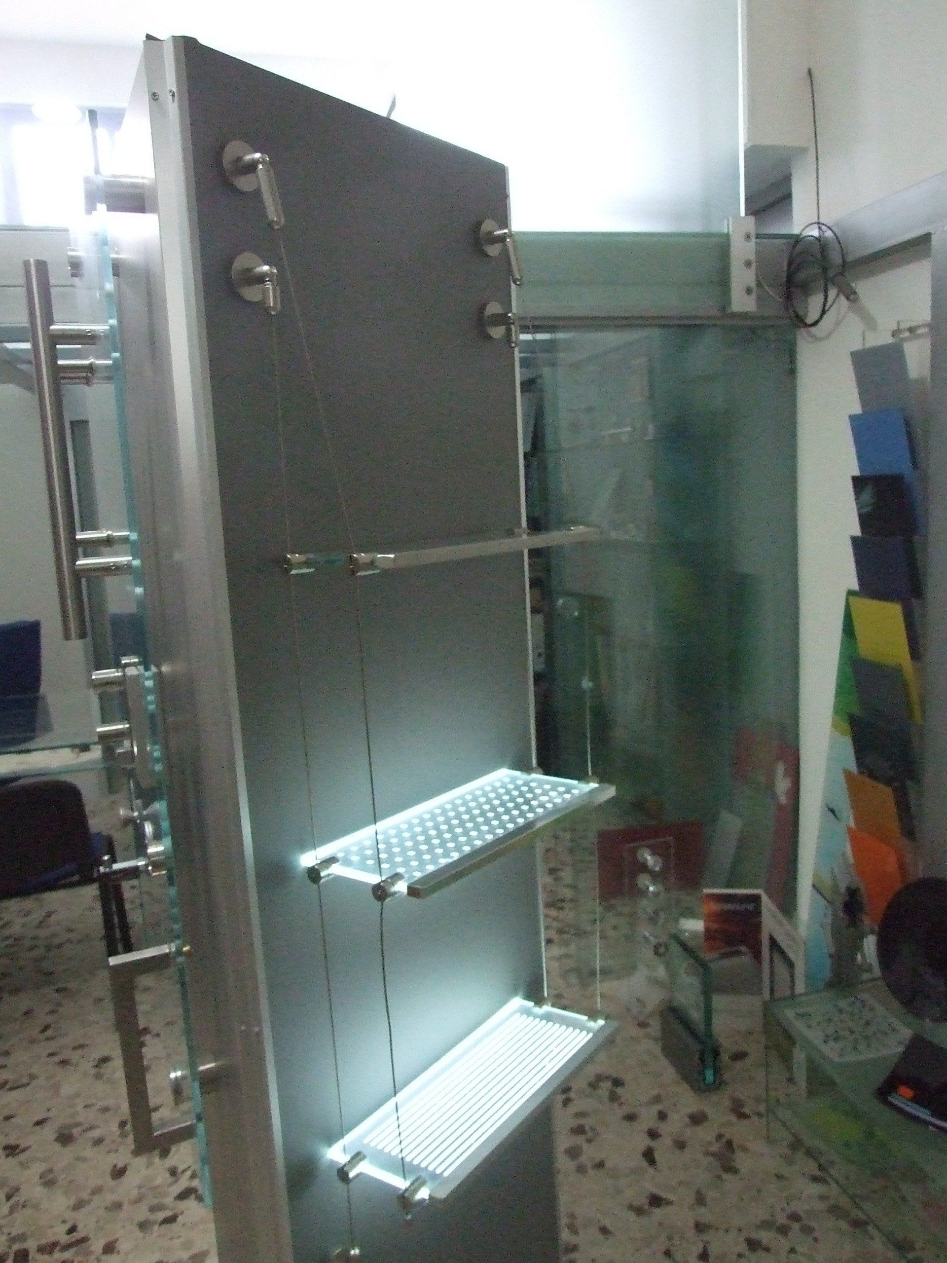 Scala in vetro extrachiaro 10 mm temperato con distanziali in acciaio cromo-lucido.