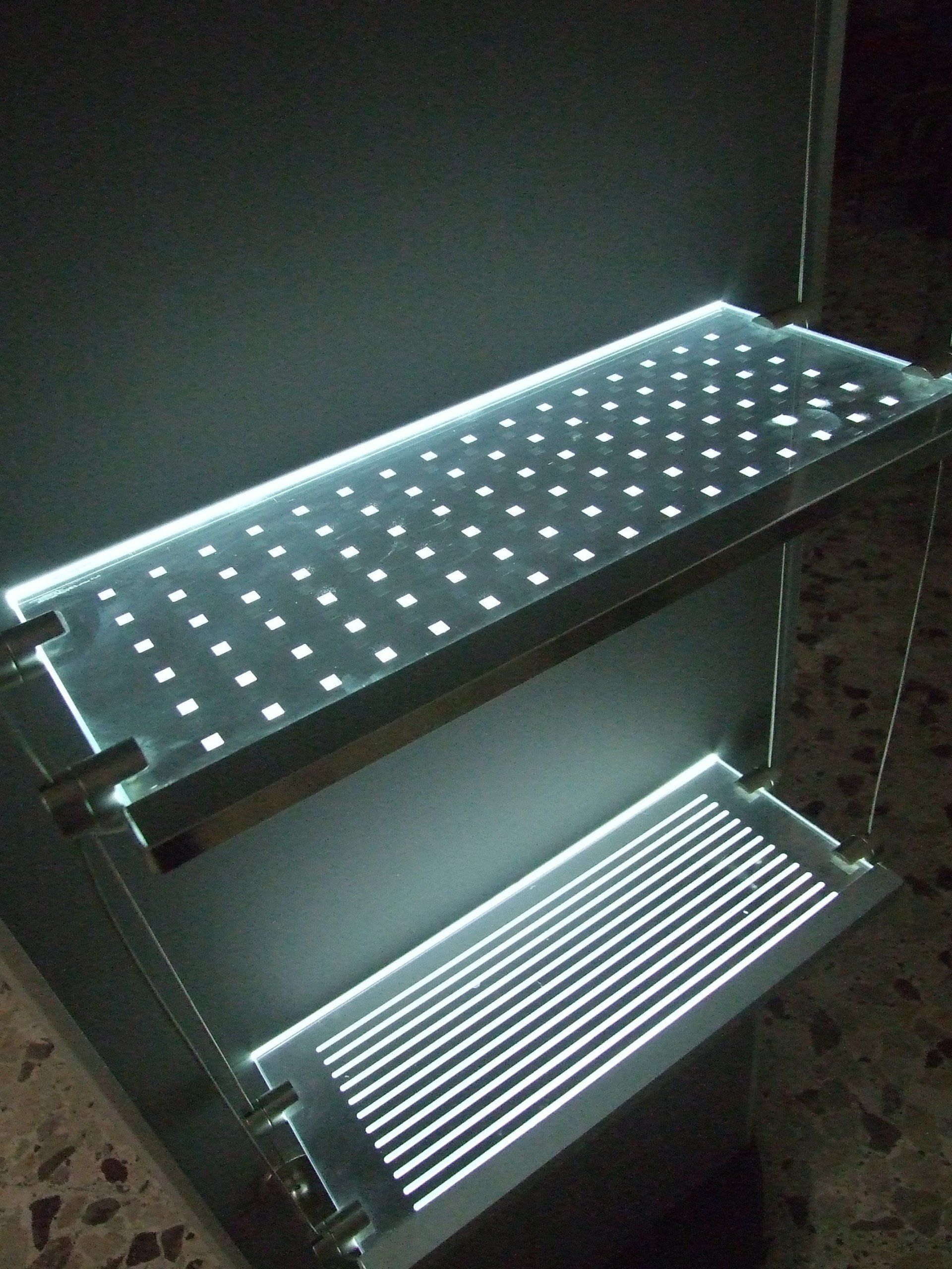 Mensole sospese con filo metallico in vetro extrachiaro 8 mm temperato, motivo geometrico sabbiato, profilo in alluminio e strip led.