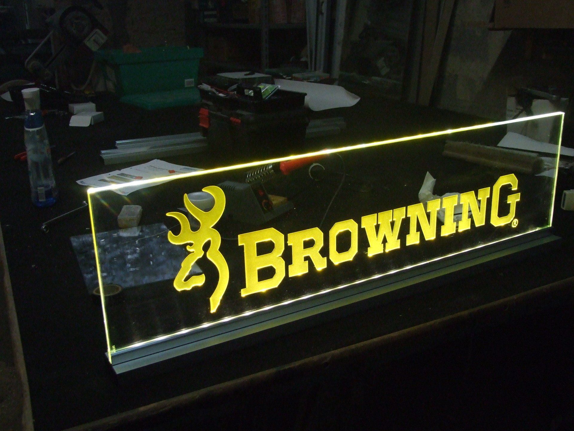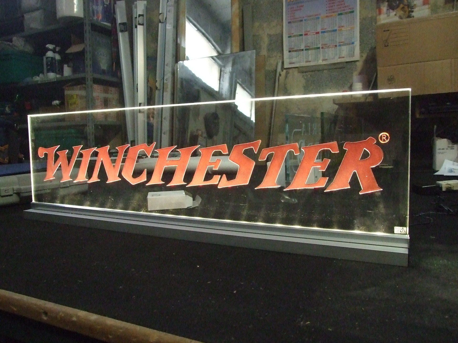 Targa pubblicitaria in vetro extrachiaro 8 mm temperato con decoro sabbiato e decorato a mano, strip led e base in alluminio satinato. Realizzata per "Armeria Lonardo", Teano (CE). Pezzo unico.