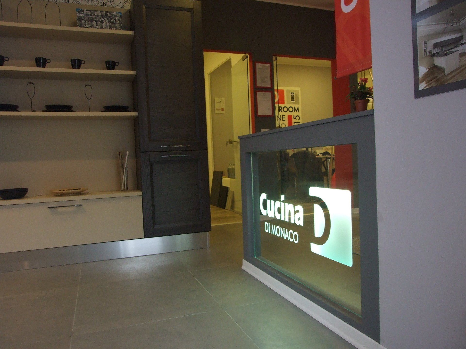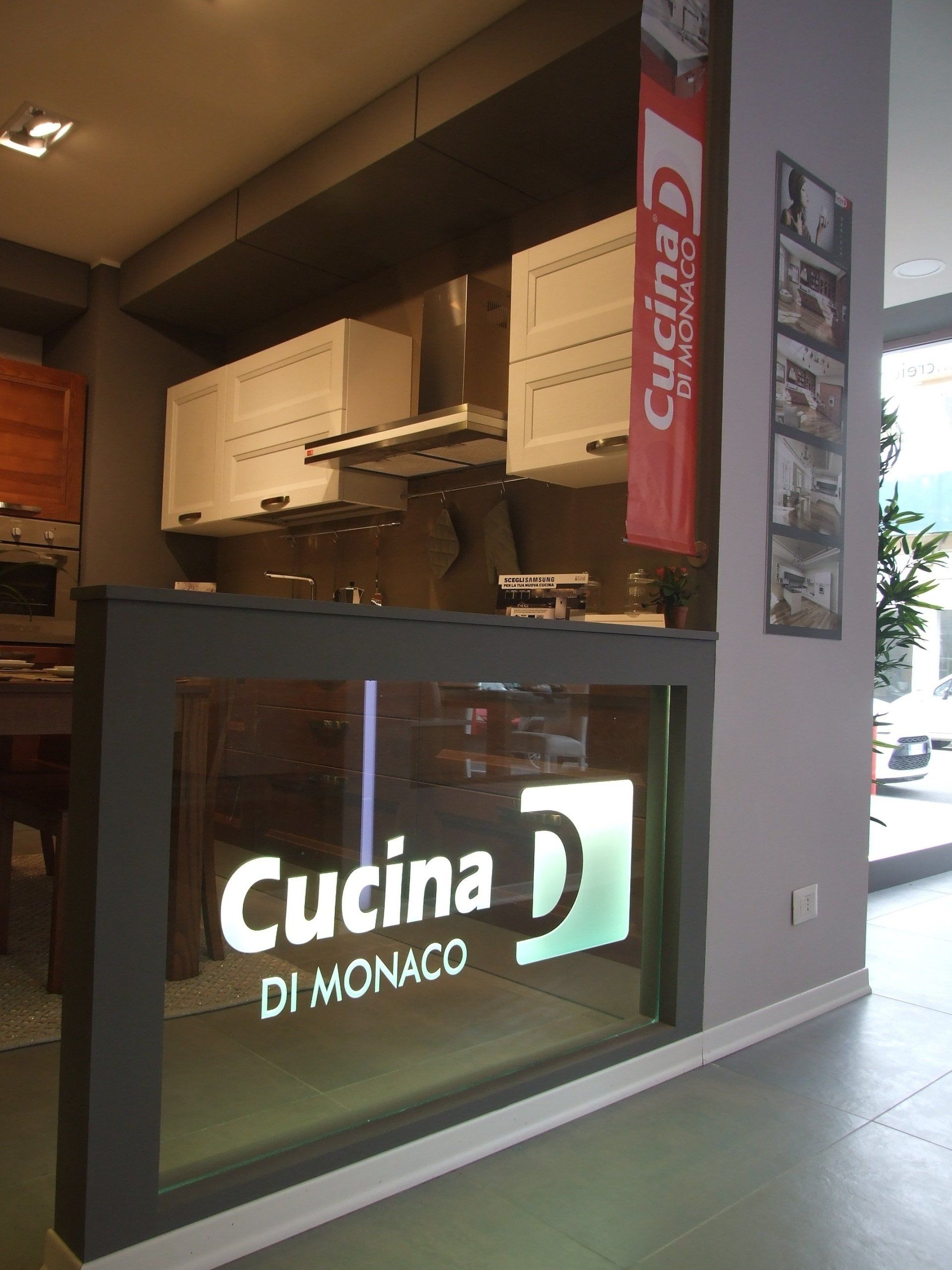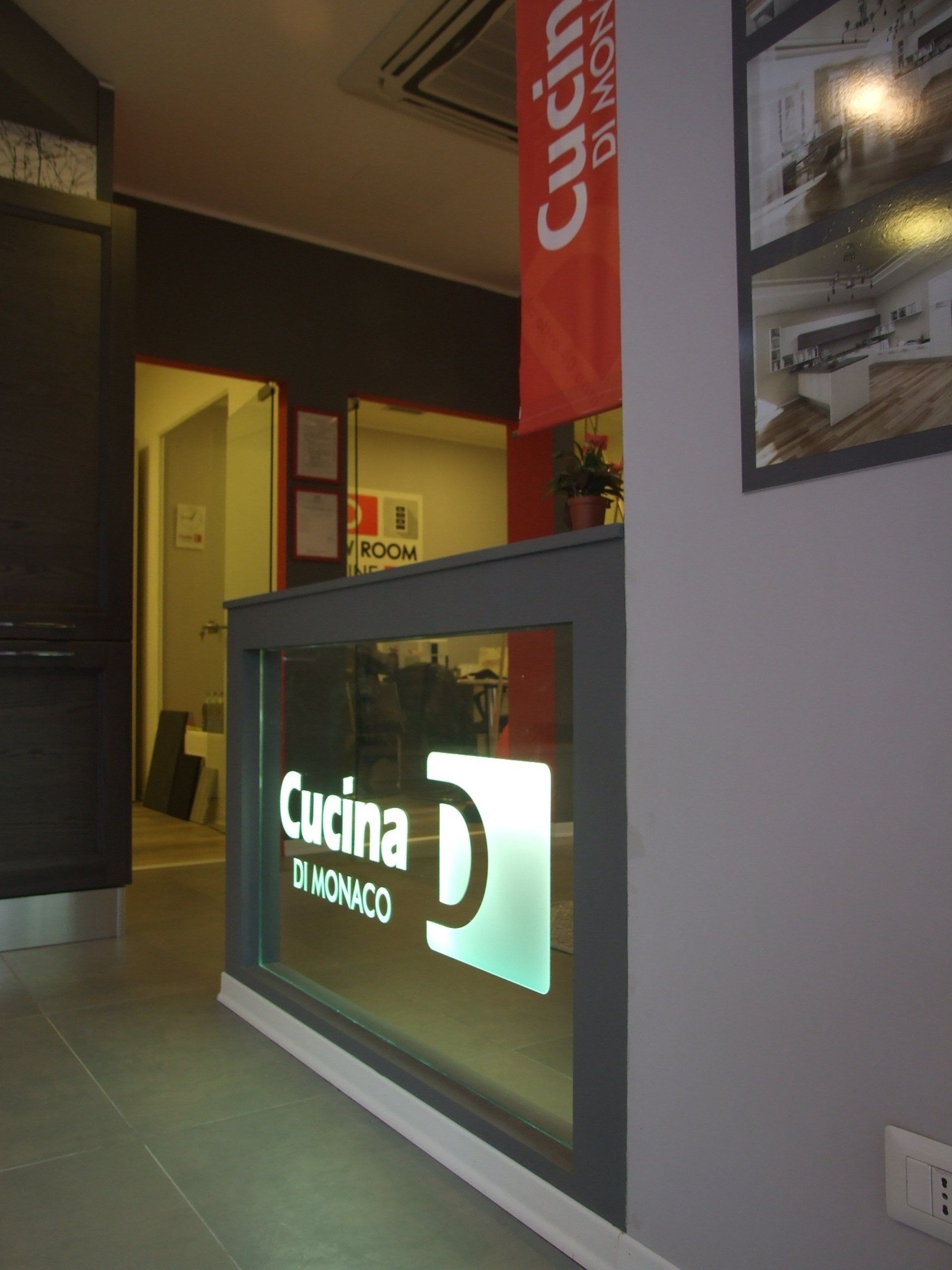Pannello pubblicitario in vetro extrachiaro 8 mm temperato con decoro sabbiato. Realizzato per Cucina D, Casapulla (CE).