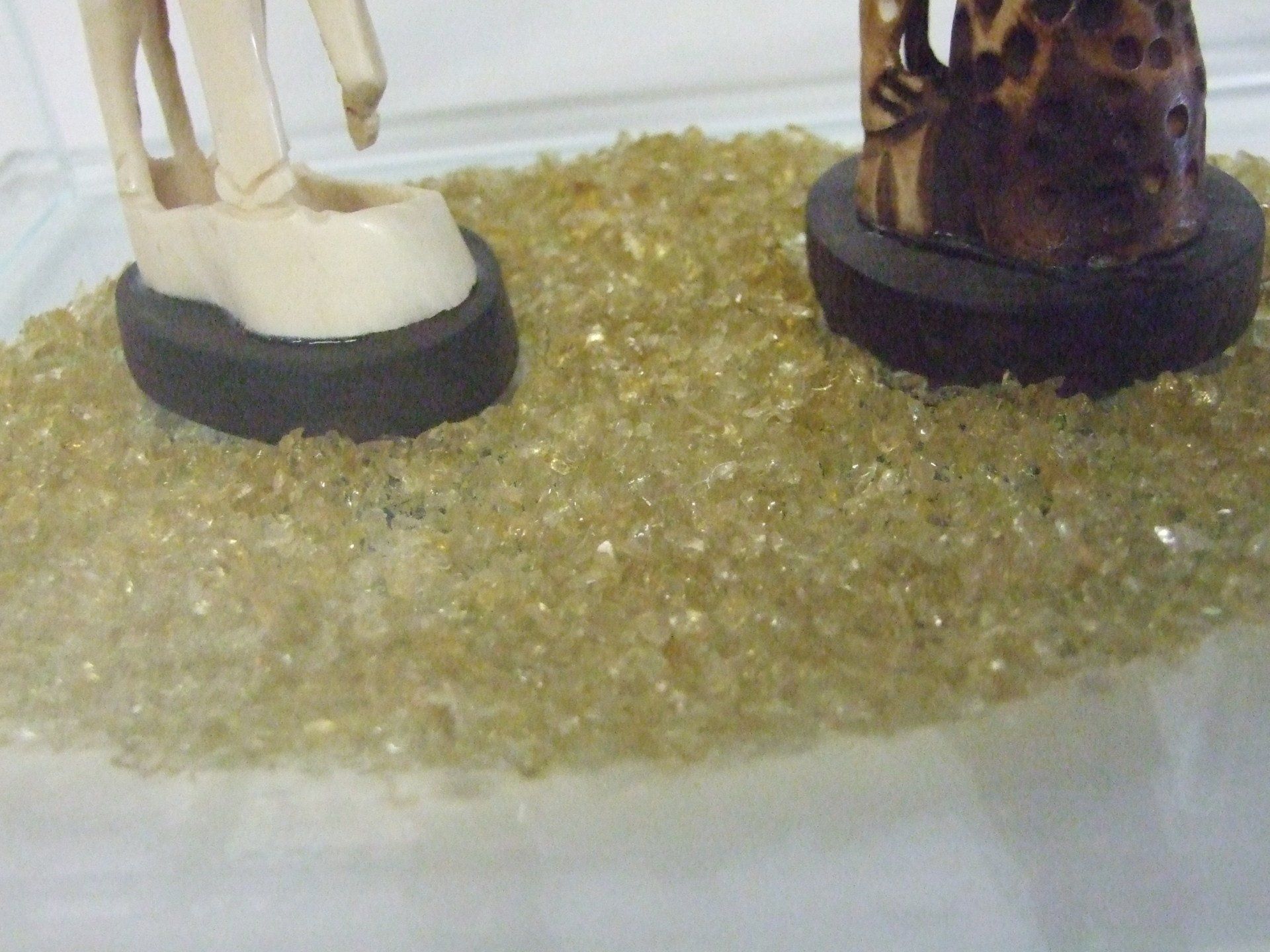 Teca per modellismo in vetro extrachiaro 6 mm, con graniglia di vetro sul fondo e base in vetro, incollata con raggi UV.