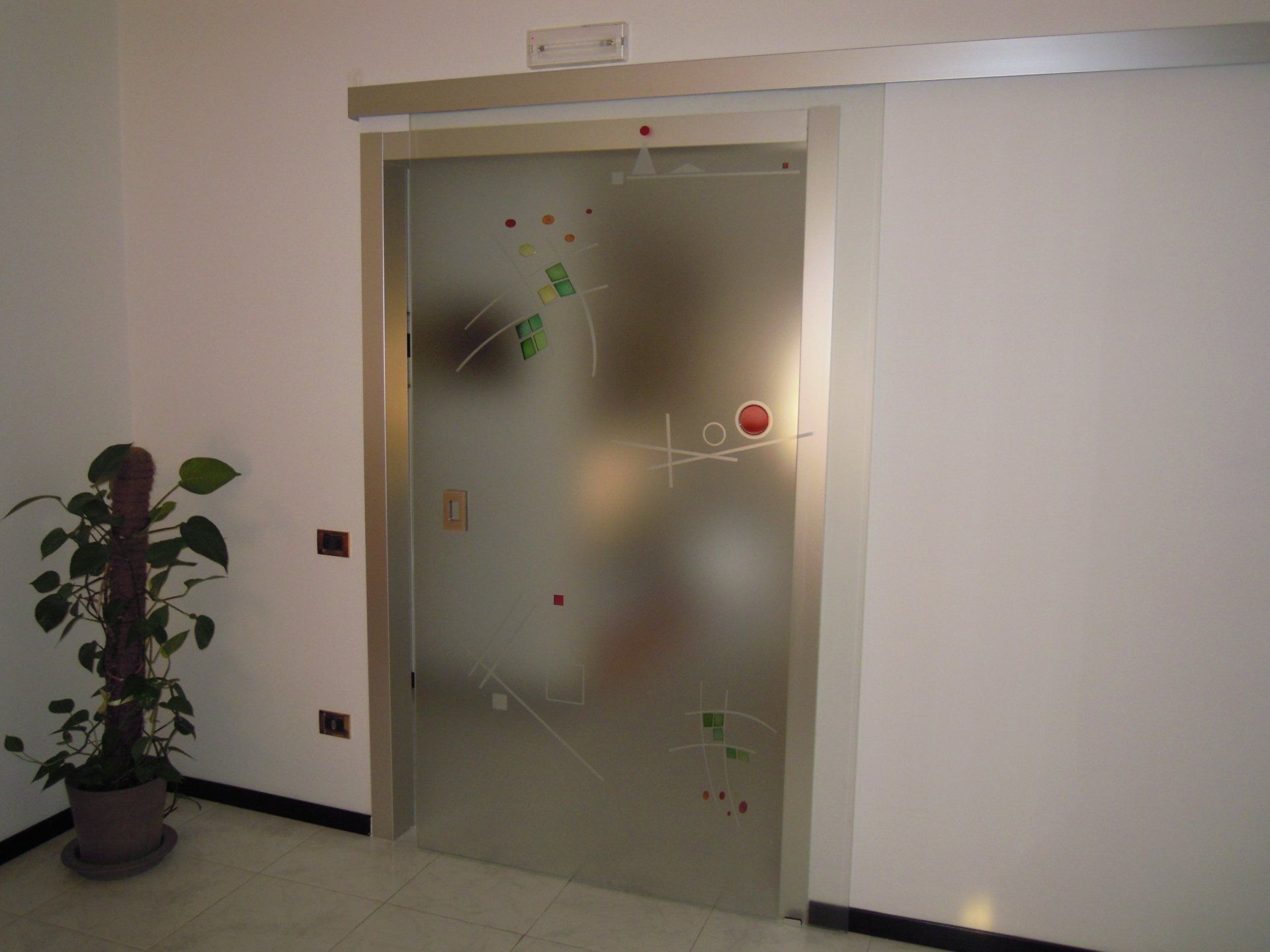 Porta scorrevole in vetro extrachiaro 8 mm temperato, decorata a mano, con veletta e profili in alluminio satinato. .