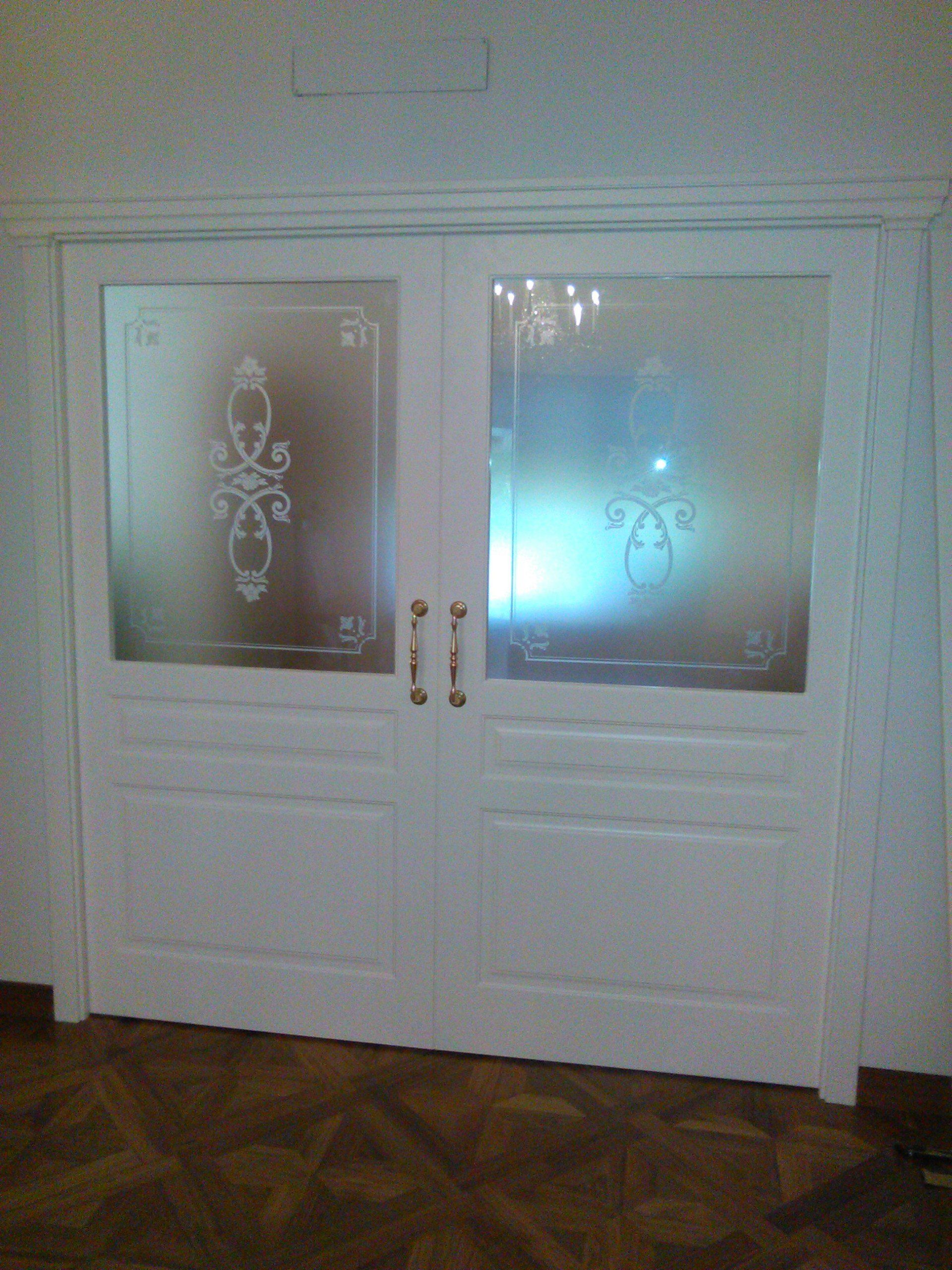 Doppia porta in legno con pannelli in vetro acetato e decoro stile vietrese sabbiato.