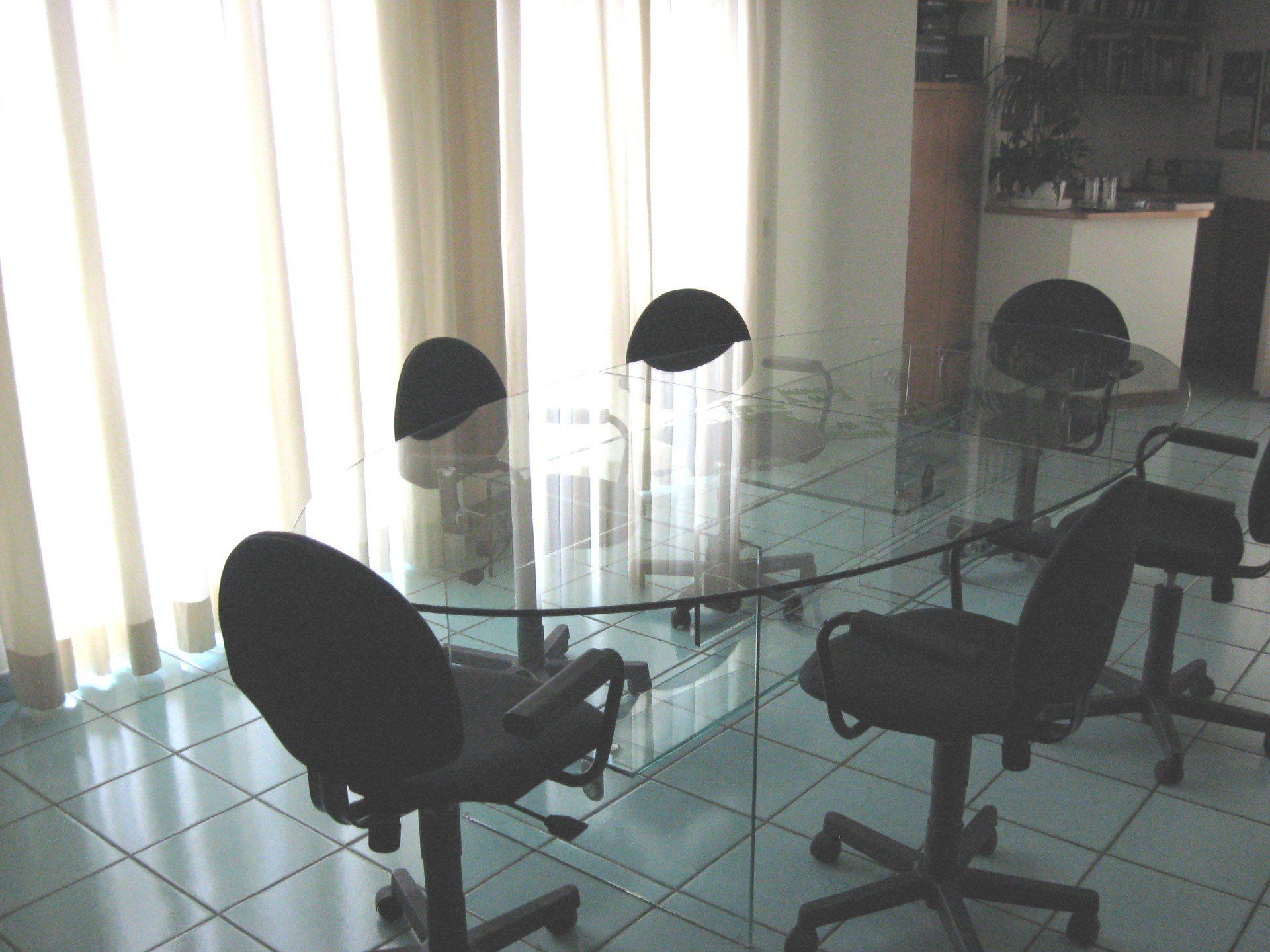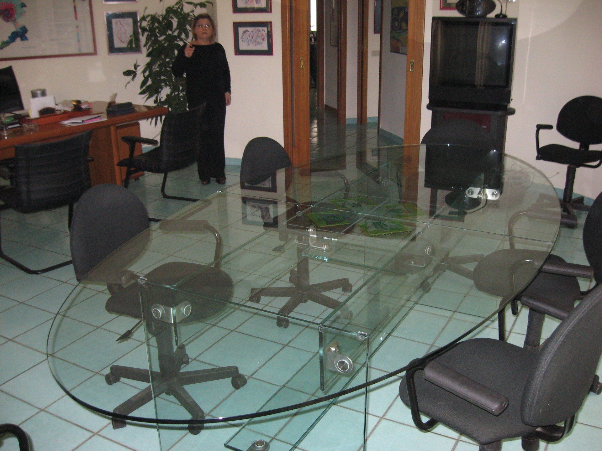 Tavolo da riunione in vetro extrachiaro 10 mm temperato con accessori in alluminio satinato.