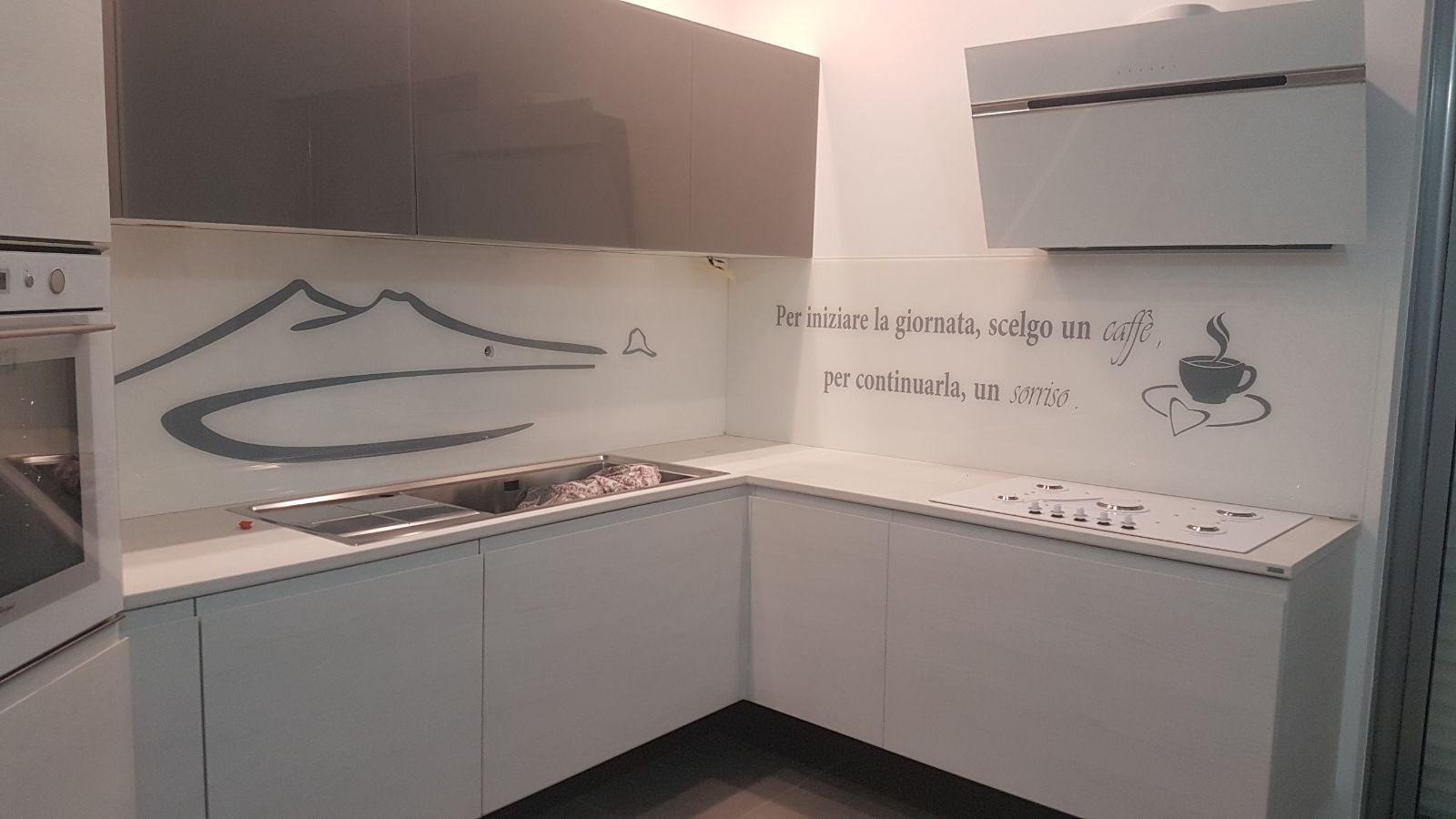 Pannello cucina in vetro 6 mm temperato smaltato bianco con decoro personalizzato.
