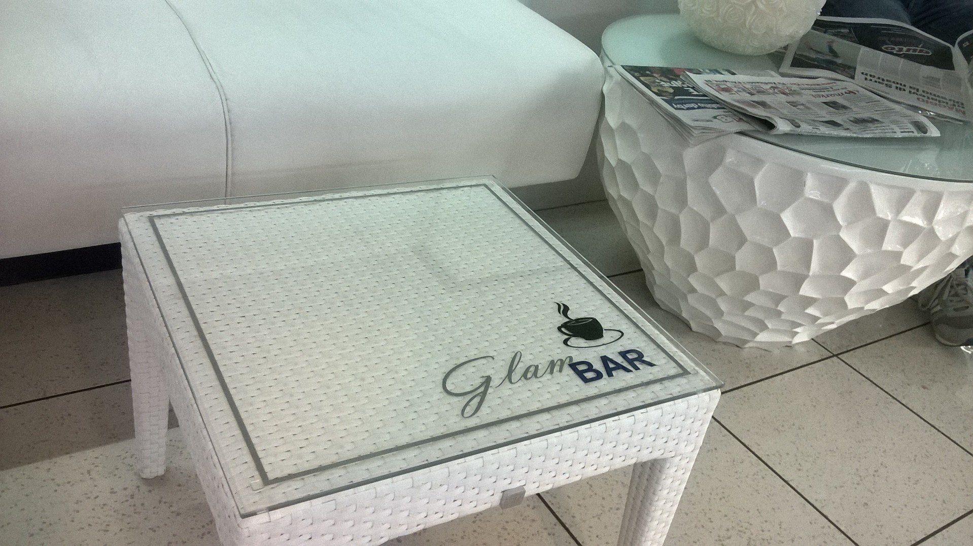 Vetro 5 mm extrachiaro temperato e decorato a mano. Realizzato per Glam Bar, Casapulla (CE).