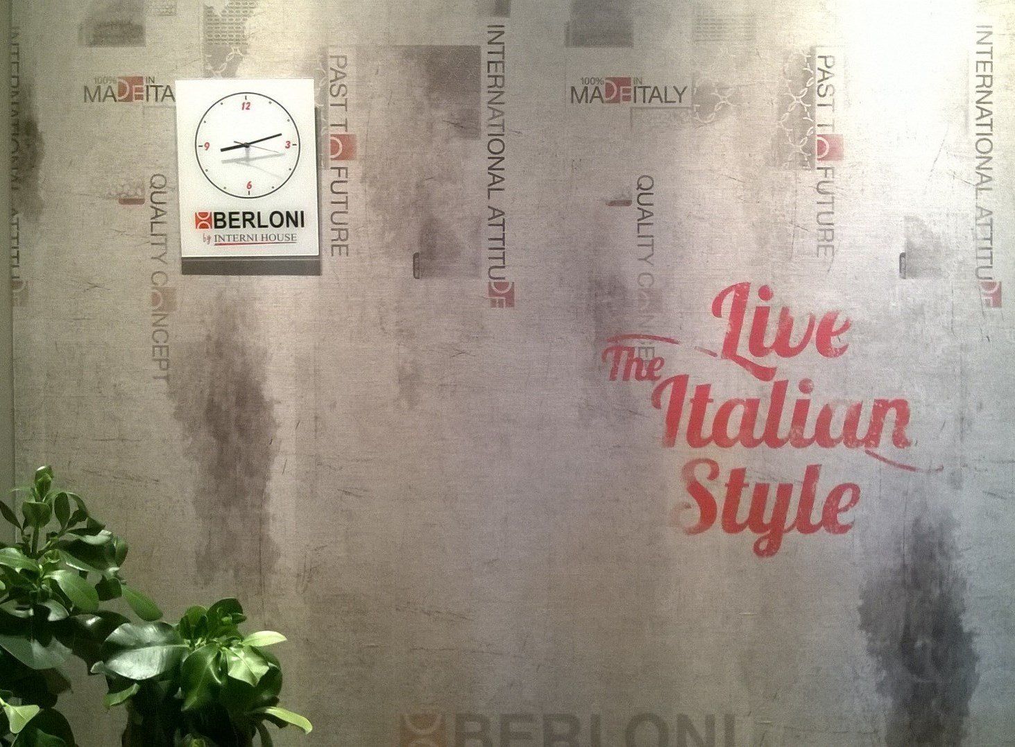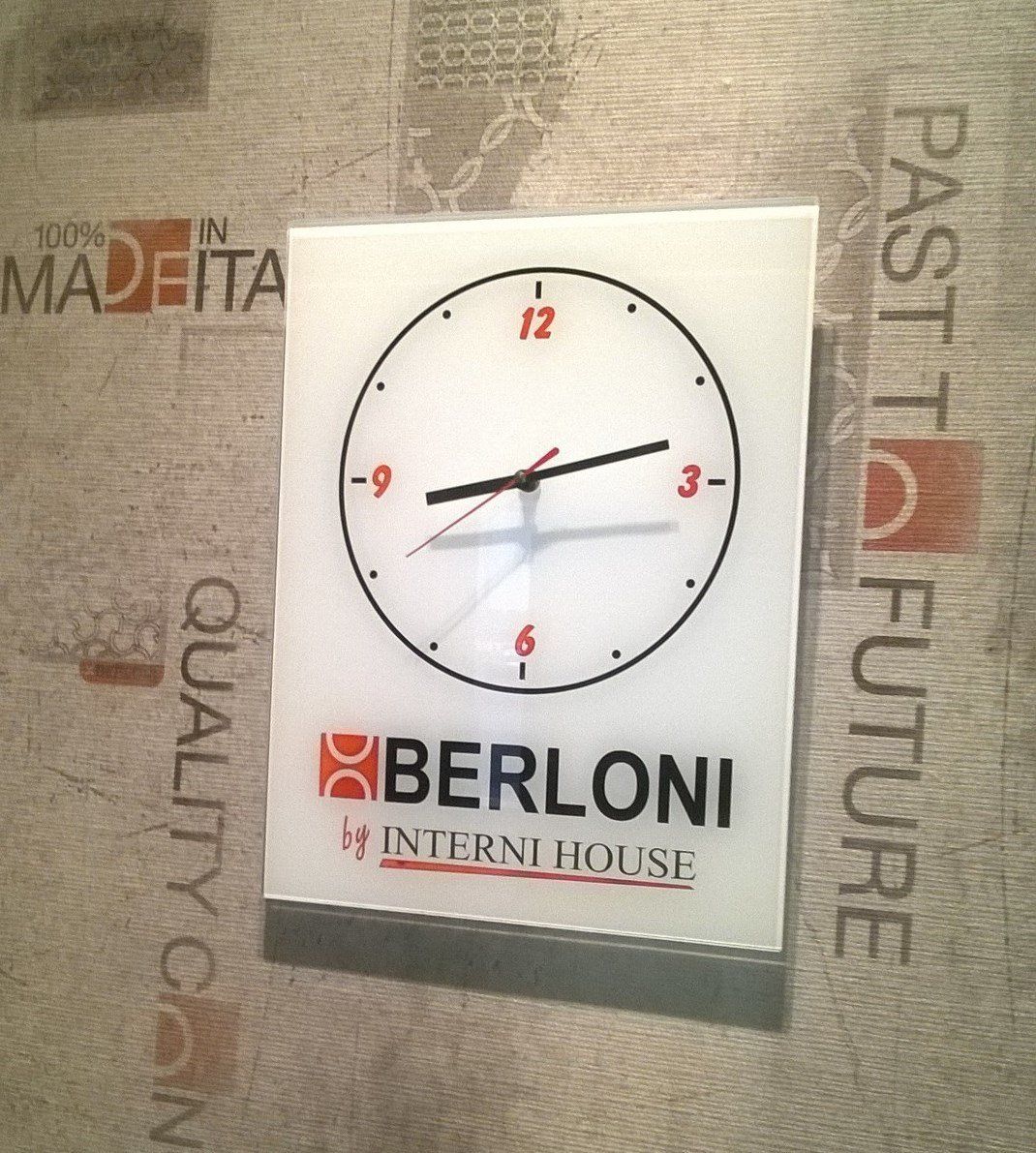 Orologio in vetro 5 mm smaltato bianco, decorato a mano. Realizzato per Berloni Store - Interni House, Casagiove (CE).